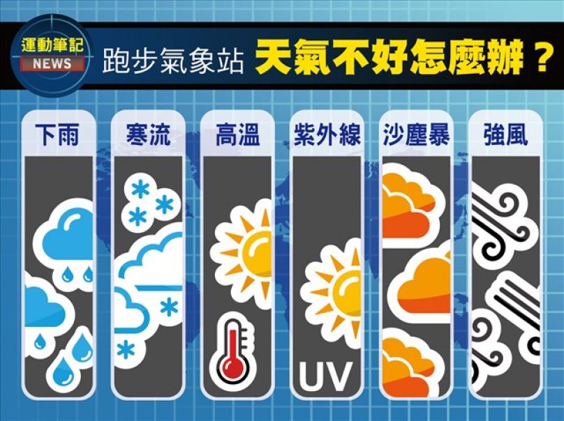 有勇無謀不可取,這只會讓你挫折連連,本週筆記焦點的「跑步氣象站」,要和各位跑者們分享不良天候的跑步秘訣,唯有做好對抗天候的萬全準備,才能風雨生信心,藉由每一次的歷練成就更堅強的自己!若遭逢賽事,惡劣天候下完賽的感動,想必更令人回味再三!