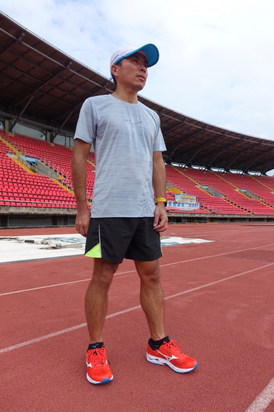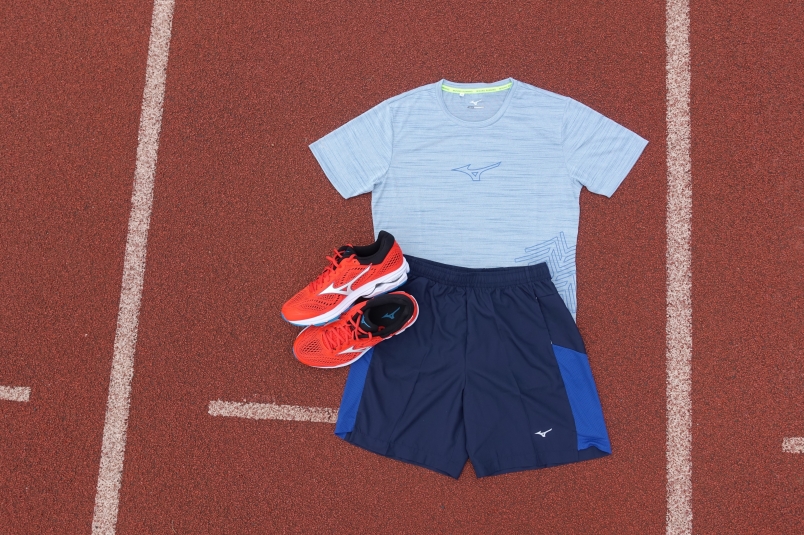 MIZUNO 吸濕排汗快乾運動短 T + 透氣排汗跑步短褲 + Wave RIDER 22 跑鞋,提供跑者夏秋之交的最佳練跑裝備。(圖片來源:吳俊毅)