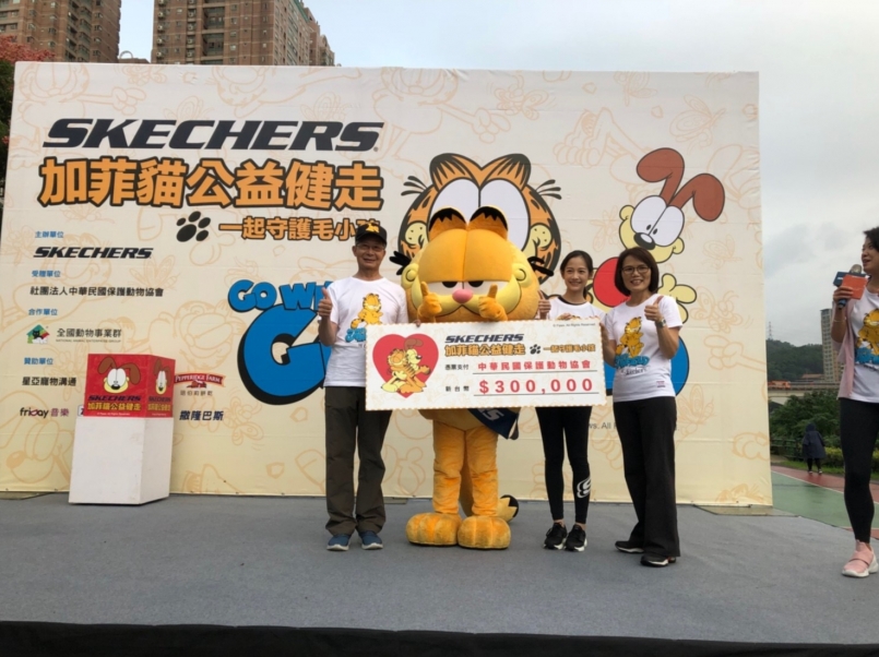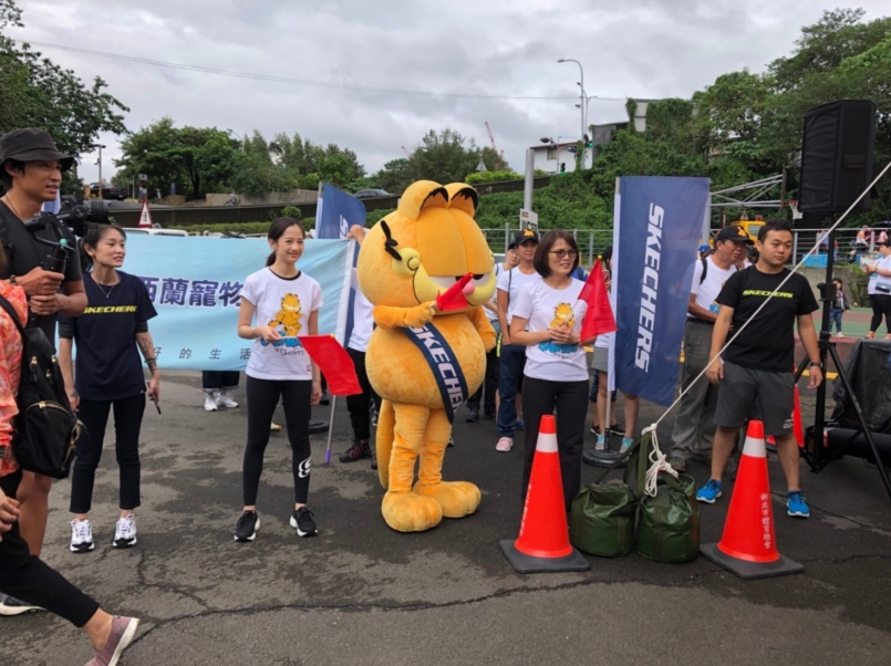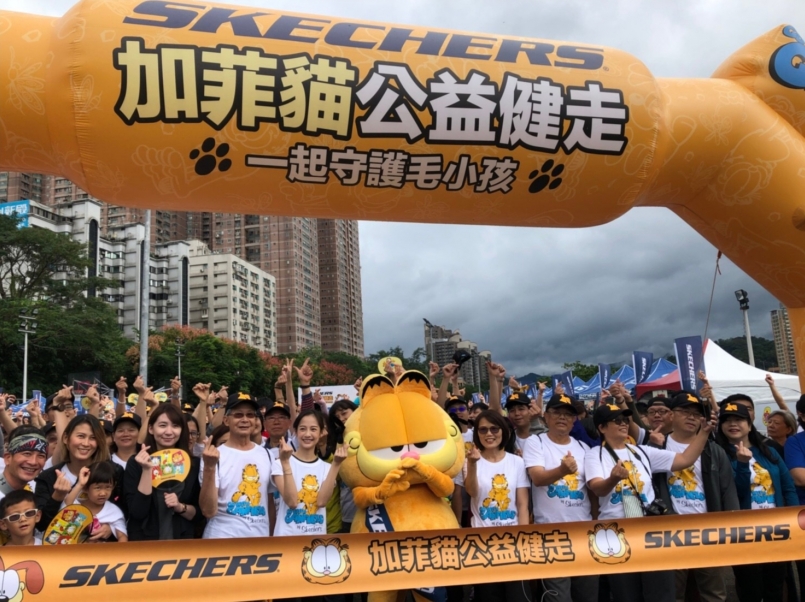 SKECHERS 前品牌代言人簡嫚書與加菲貓快樂揮旗開走 鼓勵大家運動做公益(圖片來源:SKECHERS)