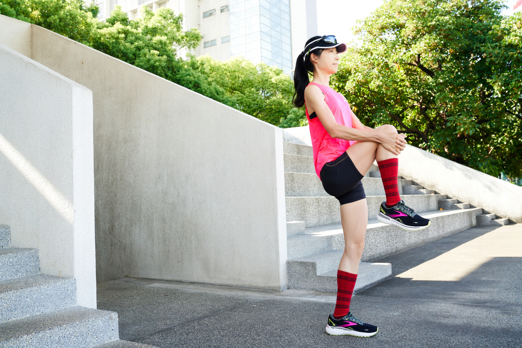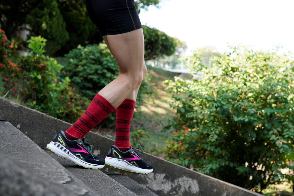 我偶而也會以階梯來訓練腿部肌力及反應力,可以在起跑前、後穿插訓練,增加靈敏反應力。穿著 BROOKS ADRENALINE GTS 23 可以充分感受到穩定與避震的保護,即使在高高低低的階梯路段,也能讓步伐更靈敏與安全。