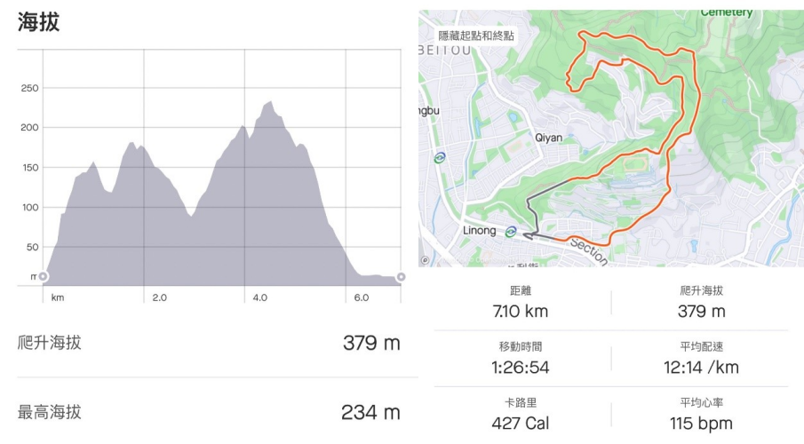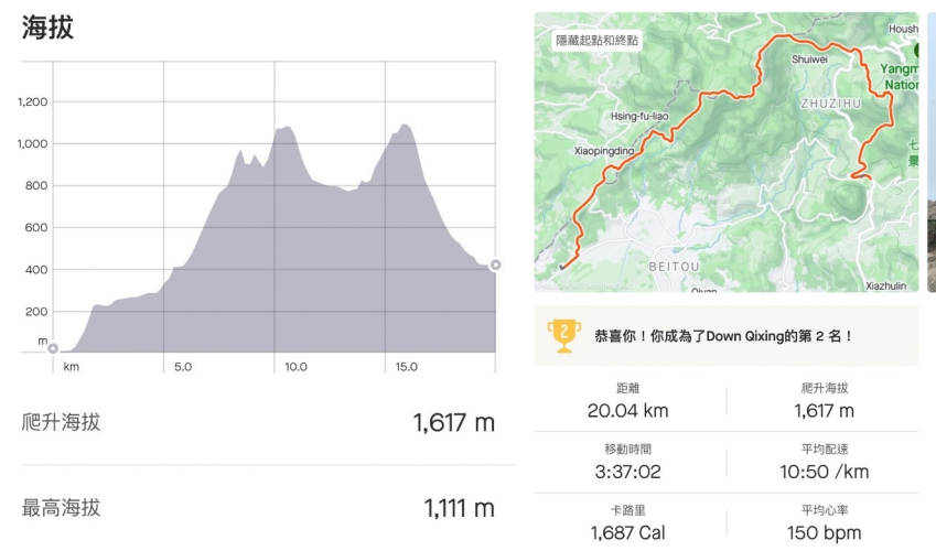 關渡上大屯連峰續走七星主峰下苗圃路線及爬升圖 。(圖片來源:陳宣諭)