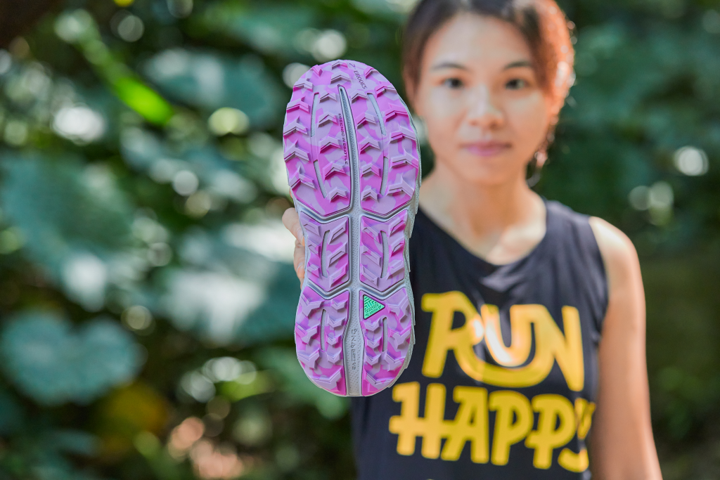 以仿生學原理,模擬生物設計,借鑒山羊蹄的解剖結構,增加抓地力;而前腳掌大底的分區設計,除了能更好地抓握崎嶇的地面,還強化了控制力,讓步伐更靈活。搭配 TrailTack 越野導引活性黏橡膠,使用 25% 的回收材料製成,提供良好的抓地力,在觸底瞬間有如吸盤抓地不易滑動,在越野路面跑動時更安心。