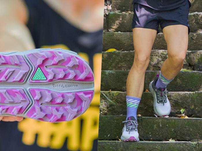 而進到山徑後,DNA LOFT V2 科技中底在石階或碎石路這類的硬地便能感受到其柔軟避震的效果。跑在碎石、樹根橫生的路線,越野動態適應系統發揮了顯著的效果,除了保護雙腳免於受傷,提供緩震的腳感,大底還強化了跑者腳步的控制力,也降低了不少翻腳刀的風險。