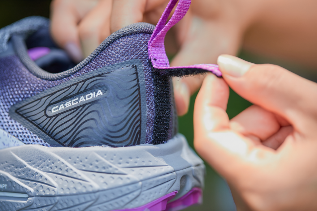 映入眼簾的是一雙灰白色調越野鞋,看似低調的配色,在鞋底搭配了柔美優雅的紫,舉手投足間一閃一滅,讓人忍不住多看一眼。此系列越野鞋的設計,以抽象藝術手法,繪製出依海拔爬升的山徑地圖,迷人的地景圖案,讓人忍不住想趕快上山跑出屬於自己的軌跡圖。拿起 CASCADIA 17,有著十足避震效果的 8mm 足跟差,同時還擁有輕盈的重量,女鞋單腳 278g(US 8.5),幫助越野跑者們的雙腿減輕不少負擔。