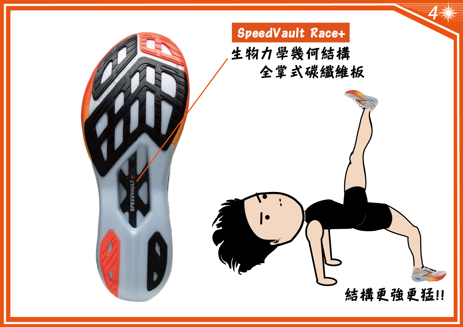 創新開發的碳板名稱為 SpeedVault Race+ Plate 是與世界級碳纖維材料公司美商 ARRIS 棱合股份有限公司合作開發「切空碳板」,可說是 HYPERION ELITE 4 的核心武器,最大特色是根據各種不同大小腳型而設計的碳板,蘊含著生物力學結構,是一整片幾何排列切空的全掌碳板,可與 DNA FLASH v2 氮氣中底完美搭配,提供穩定和靈敏的腳感,再加上與 RapidRoll Rocker 「弧形曲線」基座設計,在外觀上明顯看見中底具備流線弧度,使跑動過程中能夠更加流暢。