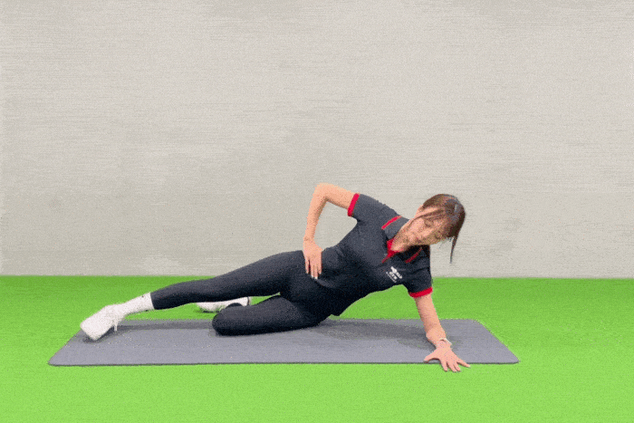 (1)手撐地,採側臥姿,肘關節置於肩關節正下方,將雙腳交叉,踩前後姿式。維持骨盆與脊柱在良好曲線(腰部不要塌陷),腹部核心穩定,縮緊肚子,另一手插腰。