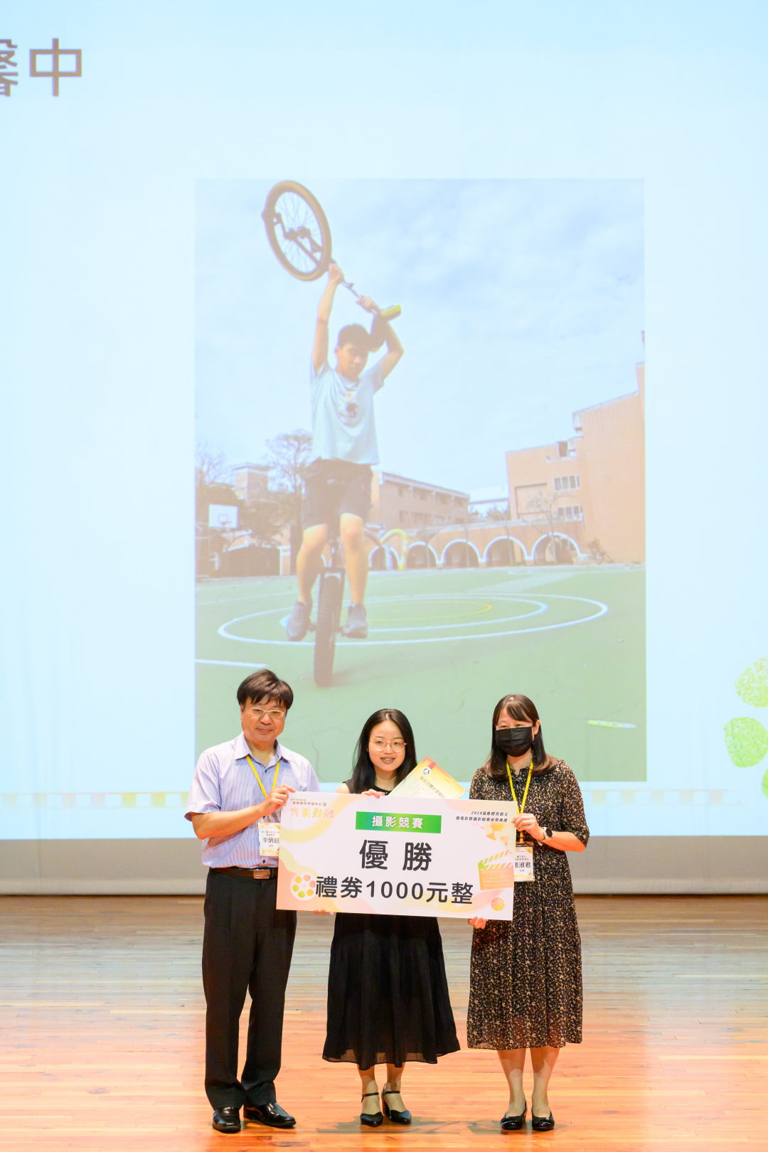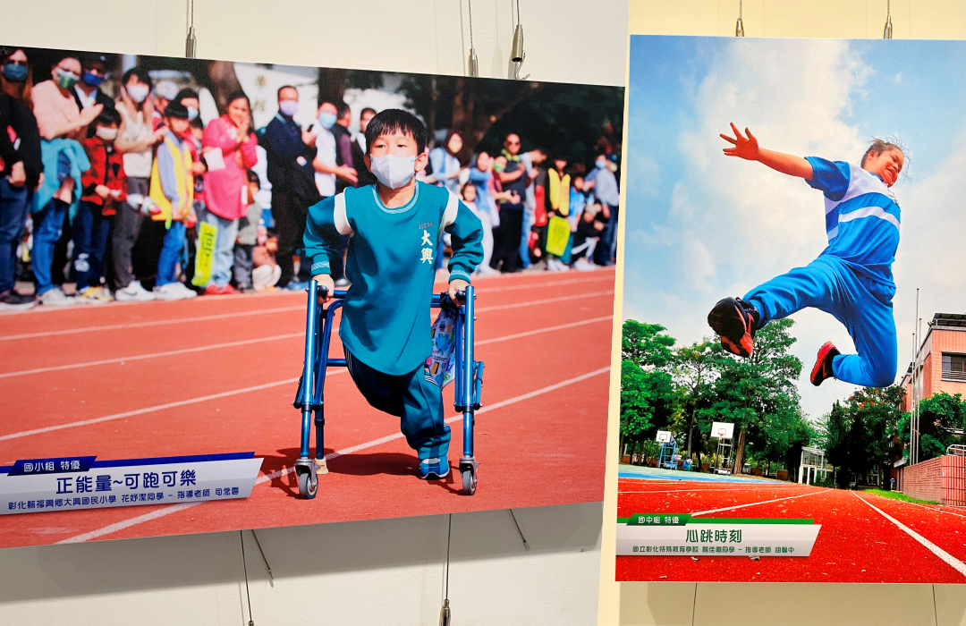 除了文字的感動,也有視覺上的發揮,「攝影」競賽獎由國小組的花妤潔以《正能量~可跑可樂》獲得特優作品,妤潔以小記者的身份,瞬間捕捉到了學弟在運動會上帥氣跑步的姿態,在妤潔的心中,這位學弟就是助行器俠,以賣力跑步的正能量,展現出勇者般的生命態度。