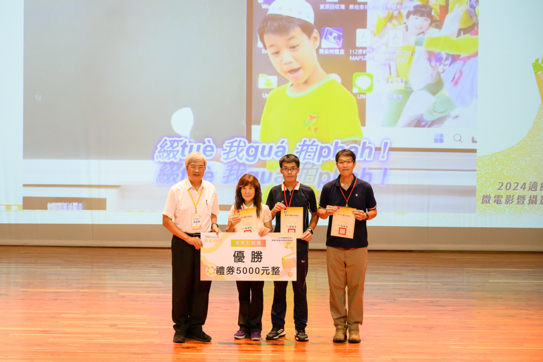 石文雀、楊心慈、潘麒麟、周育全以《綴tuè我guá拍phah!!》獲微電影競賽快閃倡議組優勝。(圖|陳逸凱)