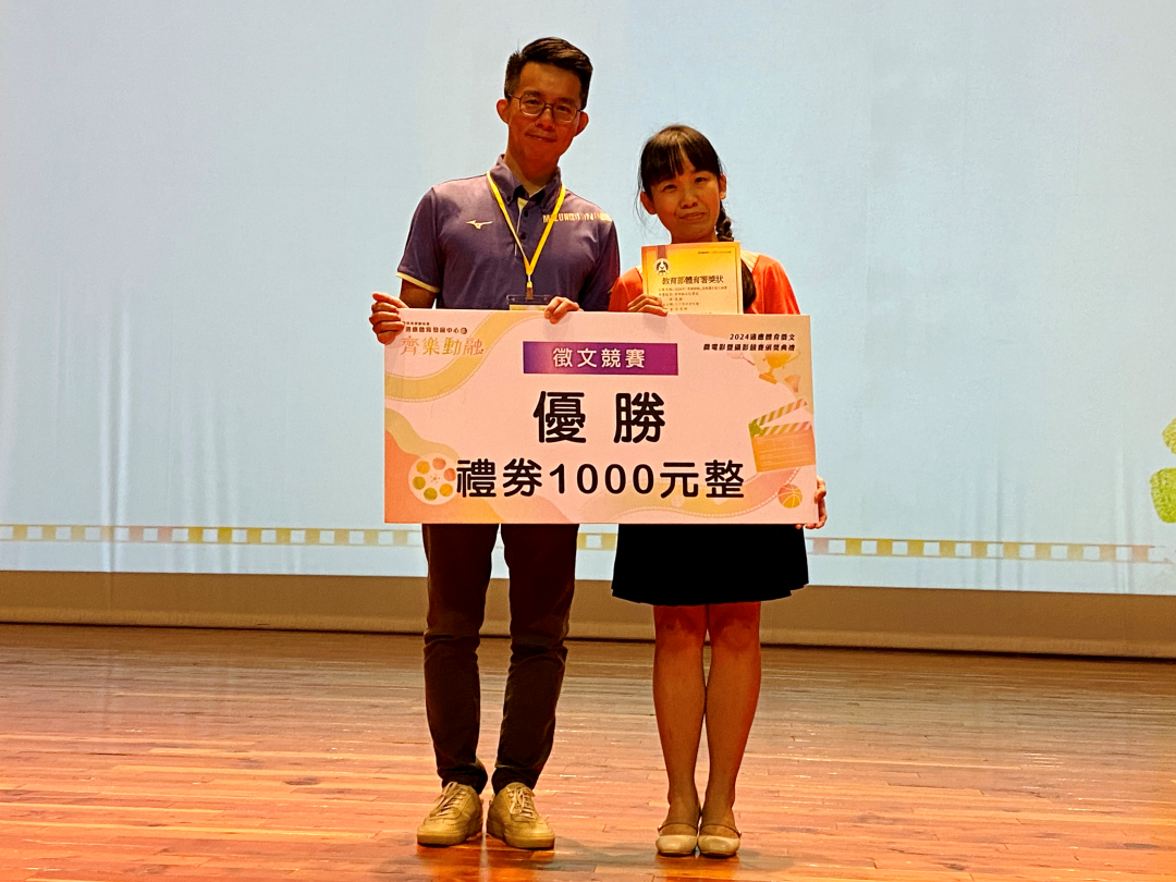 徵文國中組首獎由:賴薇茹 獲獎;優勝為:賴雅慧、林芮霆、林楷恩;評審特別獎:許峰晞、許翌傑、莊芮丞、袁芷葳、呂均杰。其中首獎賴薇茹的作品《我和我的特殊需求同學一起上體育課》文章流暢又富有轉折性,薇茹活潑描寫上地板滾球體育課的情景,文筆通順讓閱讀者彷彿一起上課,內容的起承轉合也相當完整。