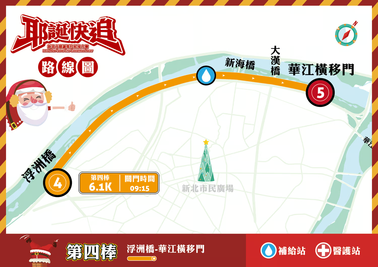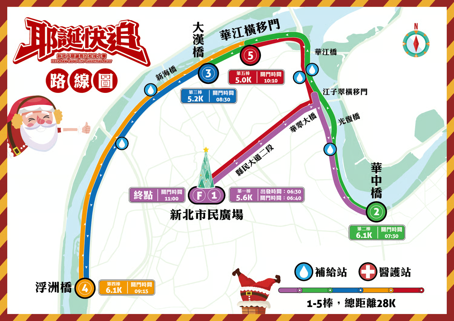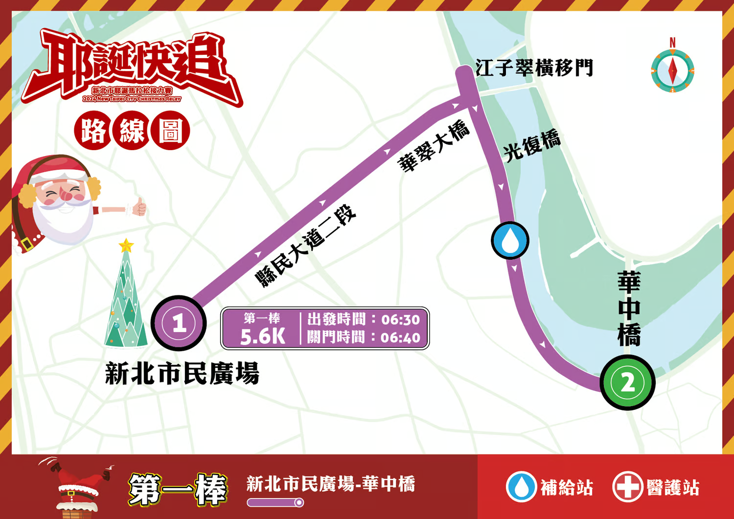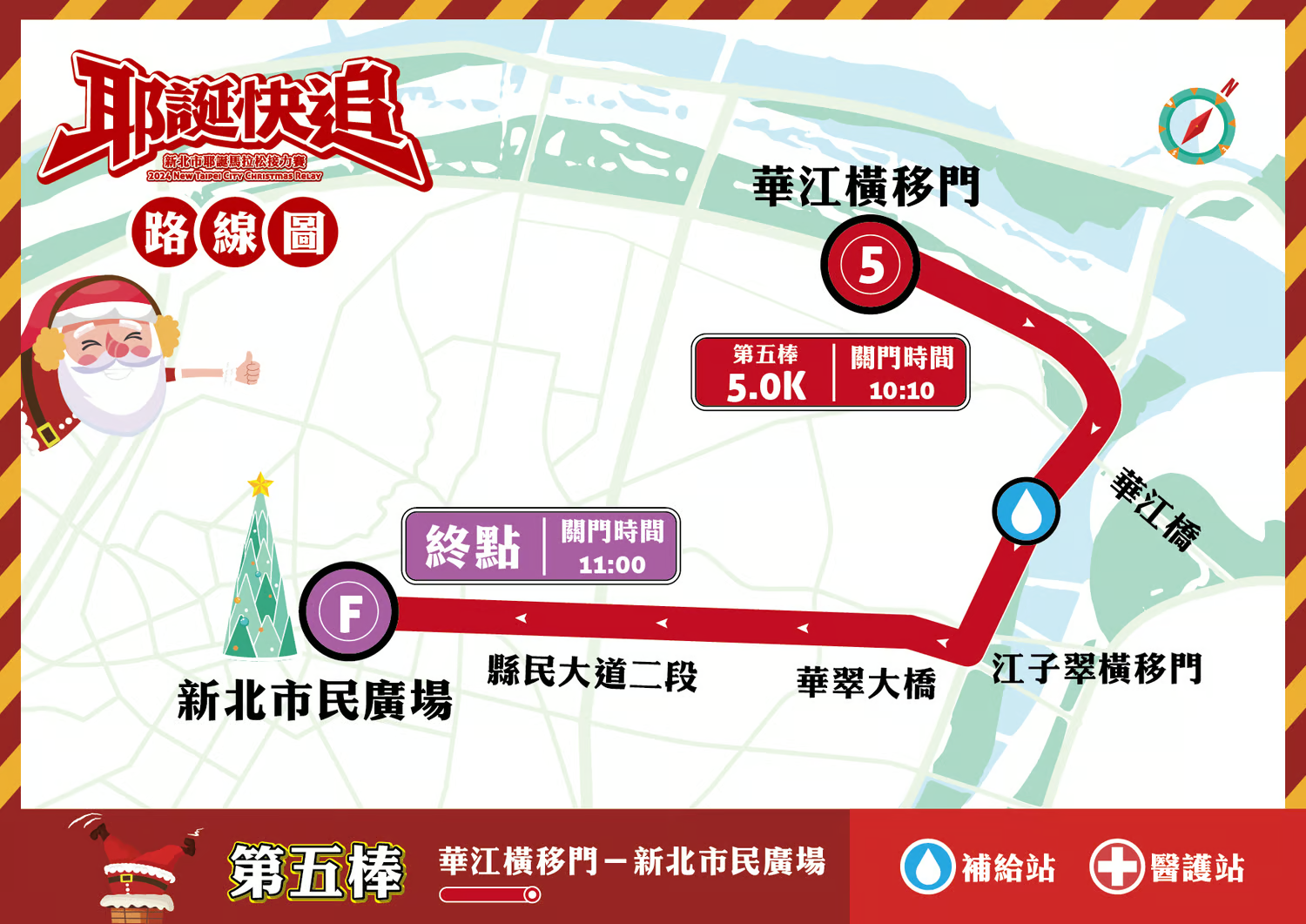 棒次/公里數 路線 第一棒(5.6K) (起點)新北市民廣場->縣民大道一段->華翠大橋(橋上)->華翠街左迴轉下橋->左轉縣民大道三段->江子翠橫移門->河濱公園-->華中橋(接棒區) 第二棒(6.1K) 華中橋(折返)-->光復橋--> 華江橋-->大漢橋(接棒區) 第三棒(5.2K) 大漢橋-->新海橋-->浮洲橋站(接棒區) 第四棒(6.1K) 浮洲橋折返-->新海橋-->大漢橋-->華江橫移門(接棒區) 第五棒(5.0K) 華江橫移門-->華江橋-->江子翠橫移門-->右轉縣民大道三段-->華翠街右迴轉上橋-->新北市民廣場(終點) 活動路線:(依實際路線為主)