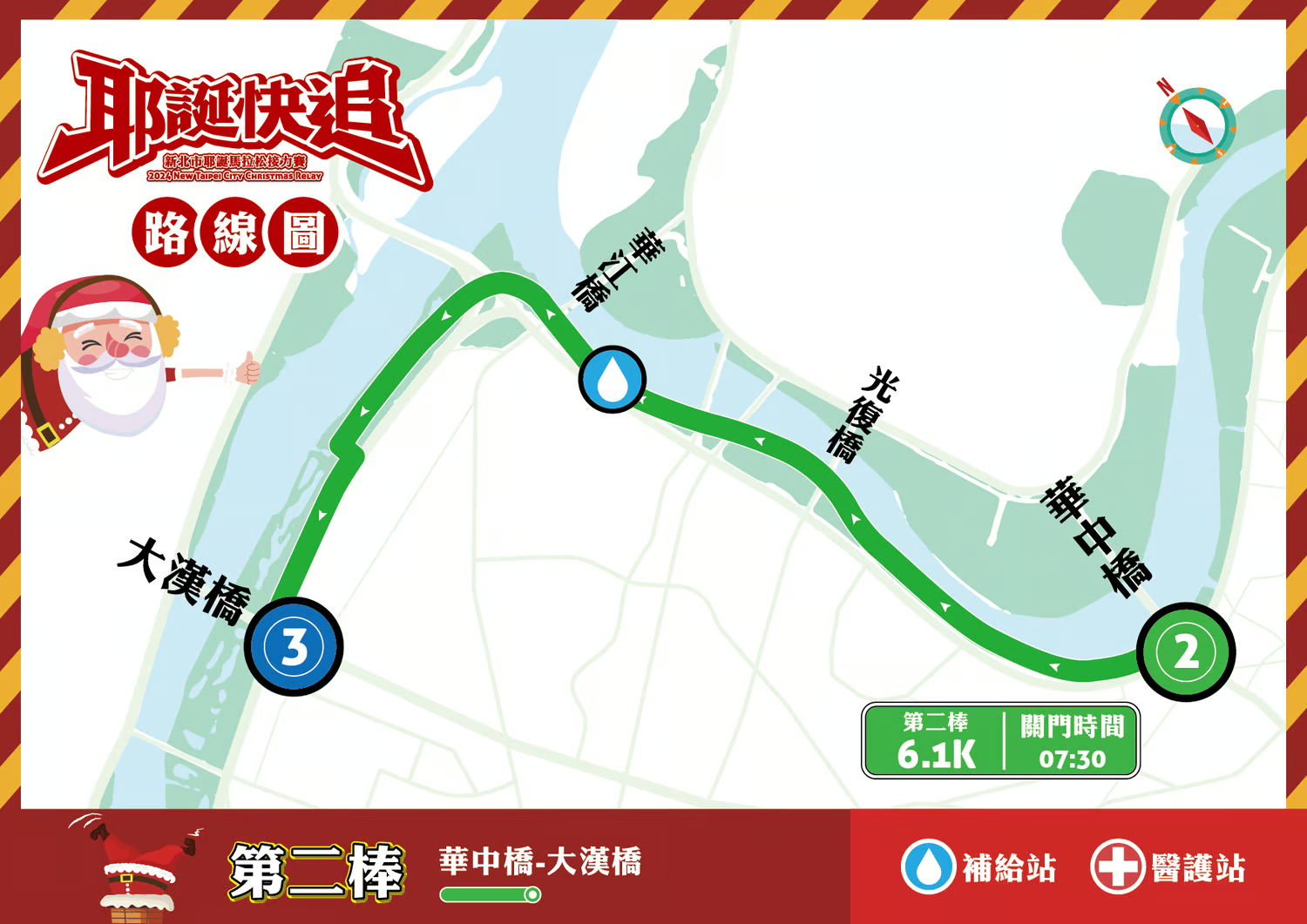 (河濱公園)10:10 終點 新北市政府市民廣場 11:00(終點關門時間) 各棒次起終點及距離棒次 起點 終點 單棒距離 累積距離 1 新北市政府 (市民廣場) 華中橋(河濱公園) 5.6 / 2 華中橋(河濱公園) 大漢橋(河濱公園) 6.1 5.6 3 大漢橋(河濱公園) 浮洲橋(河濱公園) 5.2 11.7 4 浮洲橋(河濱公園) 華江橫移門 6.1 16.9 5 華江橫移門 新北市政府 (市民廣場) 5.0 23.0 .※ 路線距離已實際測量,但因測量方式/器材不同,會有些許誤差。