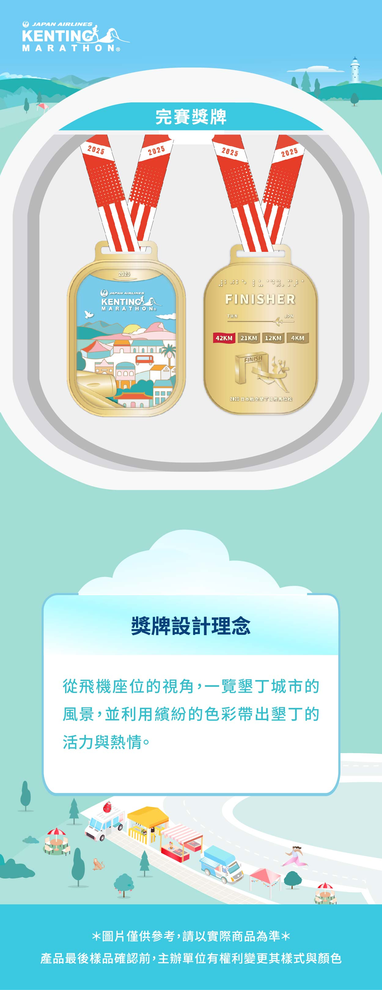 - 完賽紀念獎牌為初步樣式設計圖,最後打樣確認前,大會有權利變更其樣式與顏色。