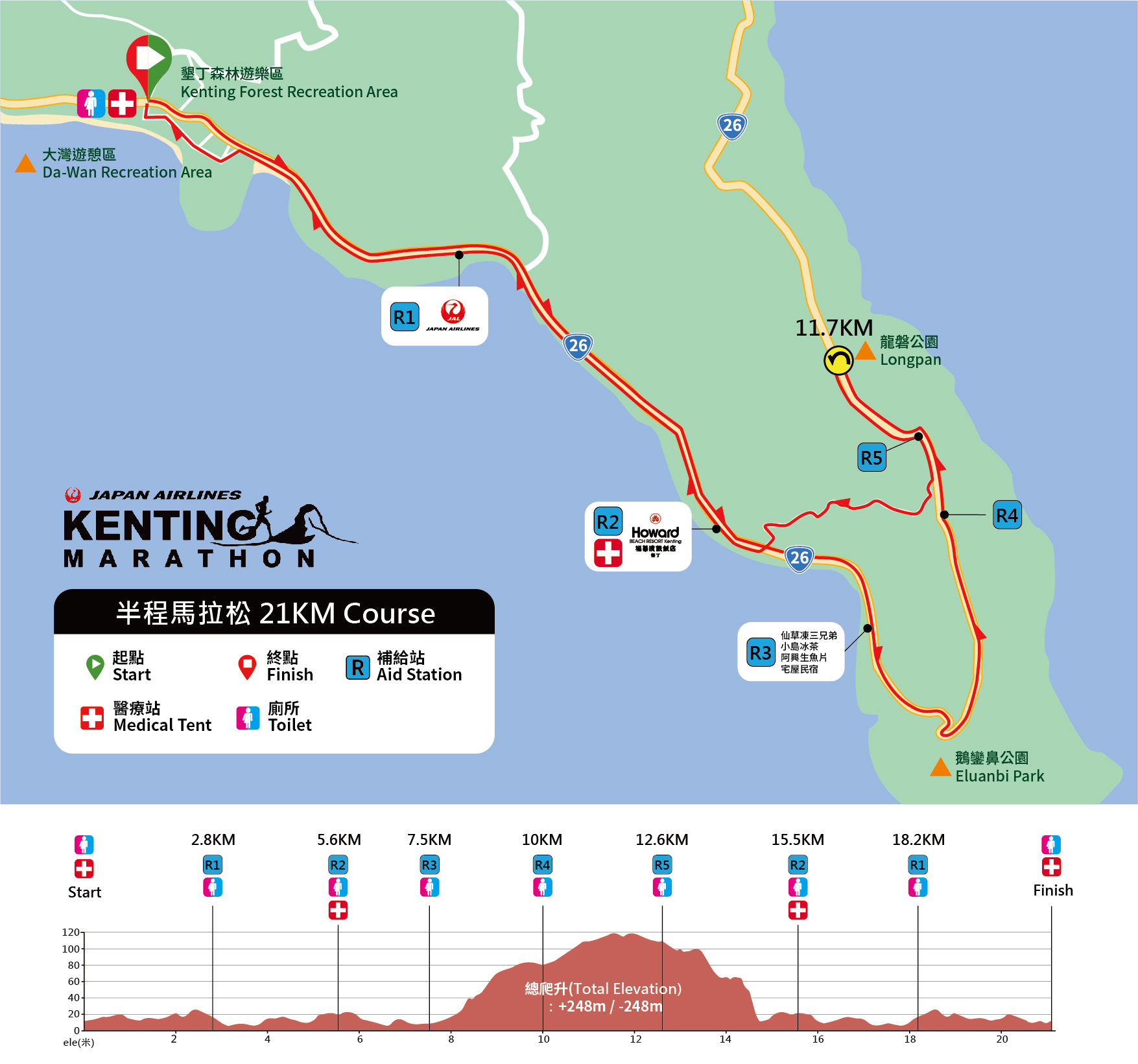 大灣草坪(起點) - 台26線 - 鵝鑾鼻 – 龍磐公園折返 - 台26線 - 埔頂路 - 台26線 – 左轉大灣路 - 大灣草坪(終點)