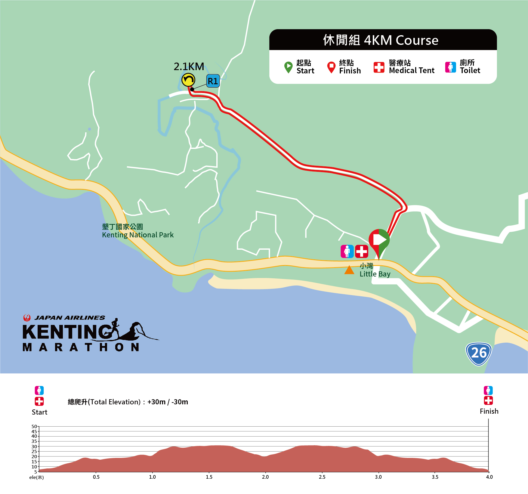 大灣草坪(起點) - 台26線 - 鵝鑾鼻 - 港口吊橋 - 縣道200甲 - 新厝路折返 - 縣道200甲 - 台26線 - 埔頂路 -台26線- 左轉大灣路 - 大灣草坪(終點)
