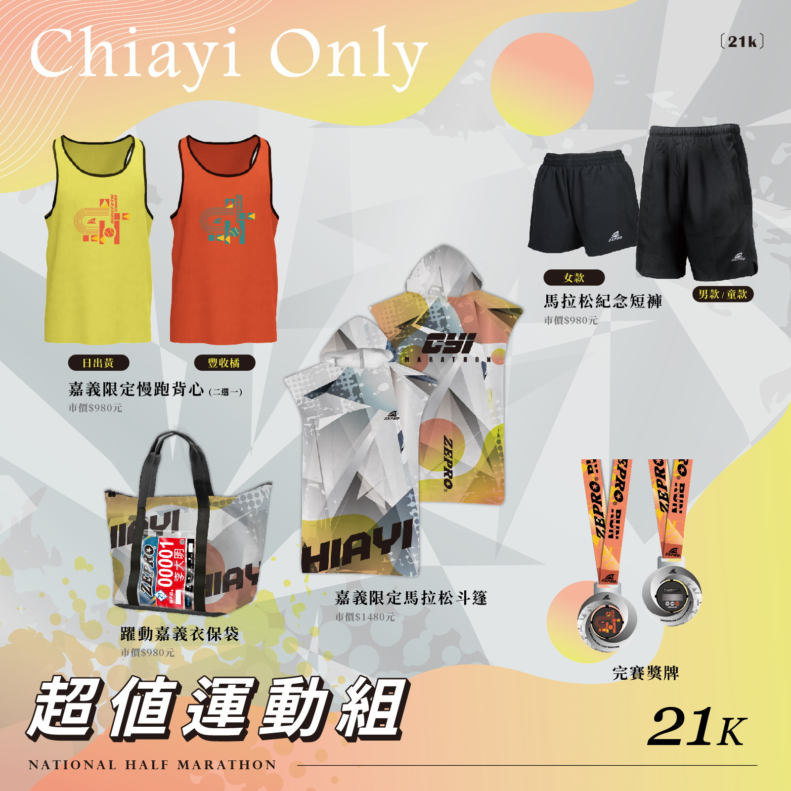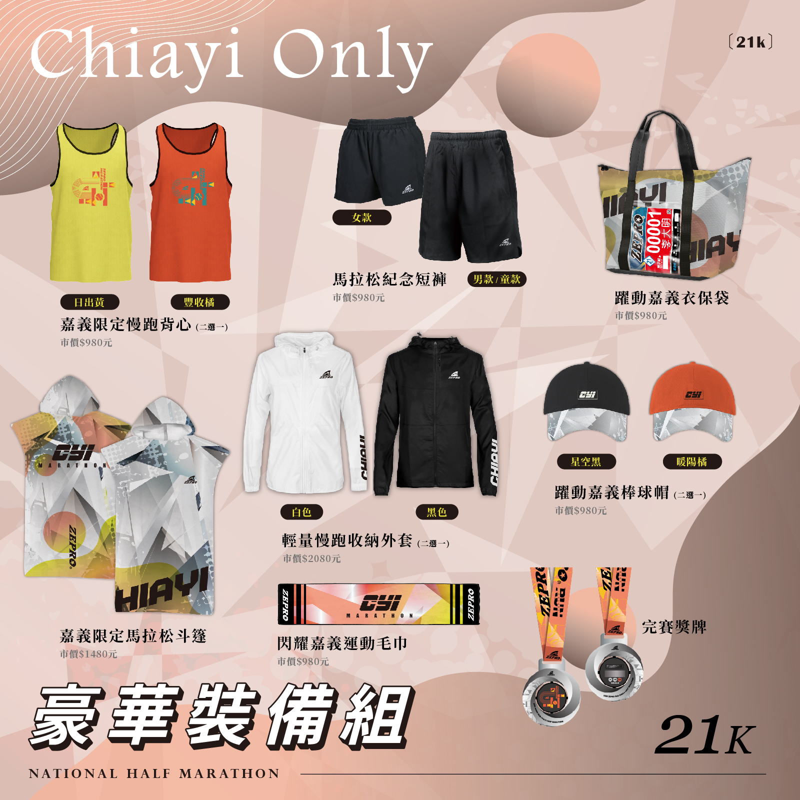 組別 21公里超值運動組 21公里豪華裝備組 報名費用 1180元 2080元 晶片押金 100 100 競賽獎勵分組 男女年齡分組 男女年齡分組 報名資格 須滿18歲 活動前物資(郵寄) 嘉義限定慢跑上衣(二選一)