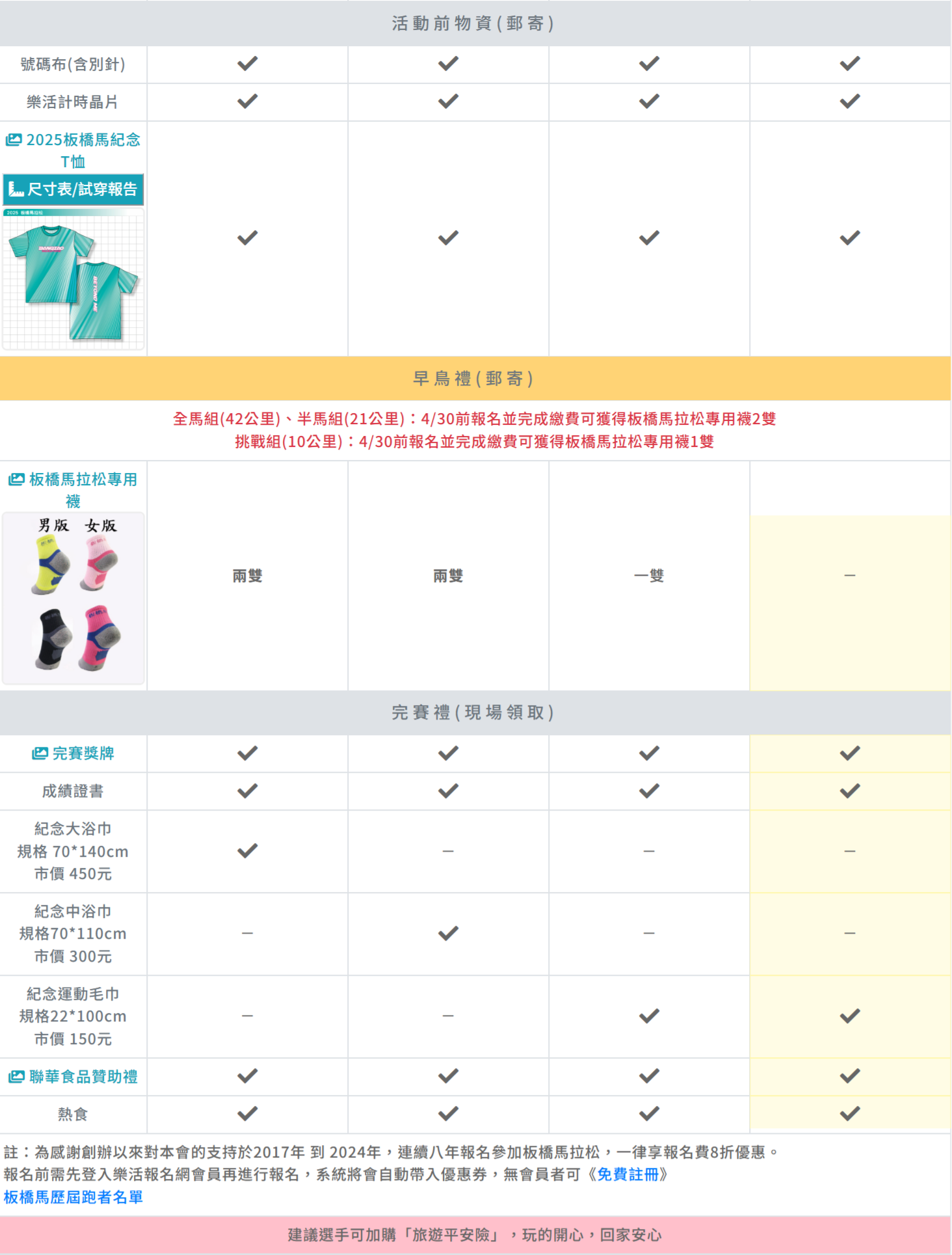 參賽贈品號碼布(含別針)、樂活計時晶片、2025板橋馬紀念T恤、板橋馬拉松專用襪、完賽獎牌、成績證書、紀念運動毛巾、聯華食品贊助禮、熱食