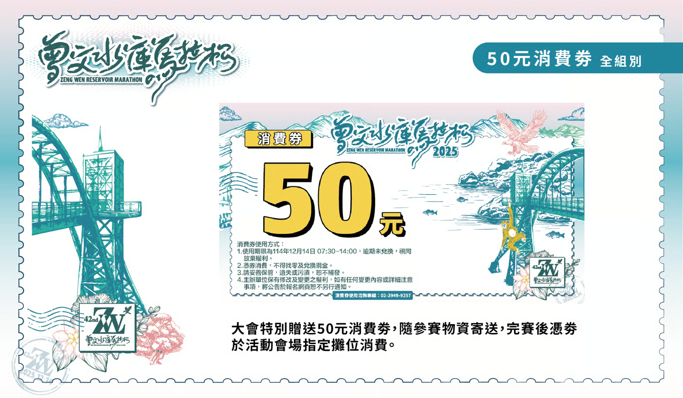 參賽贈品短袖參賽衣、號碼布、別針、50元消費券、公共意外險、人身保險、完賽禮袋、毛巾、獎牌、餐點、電子成績證書、礦泉水