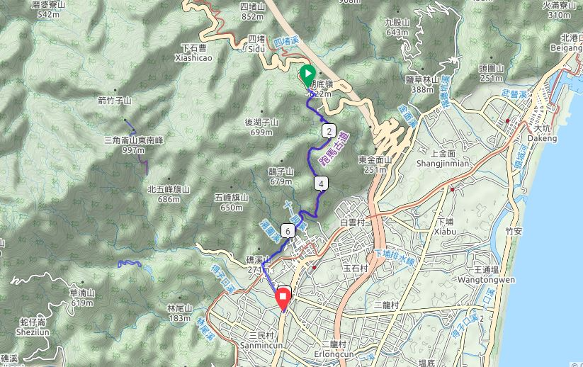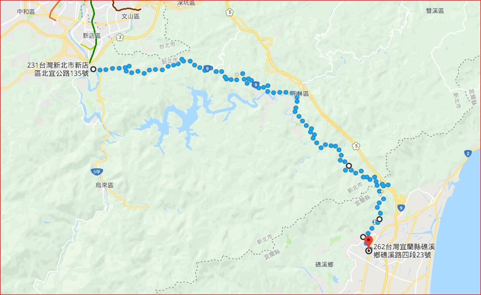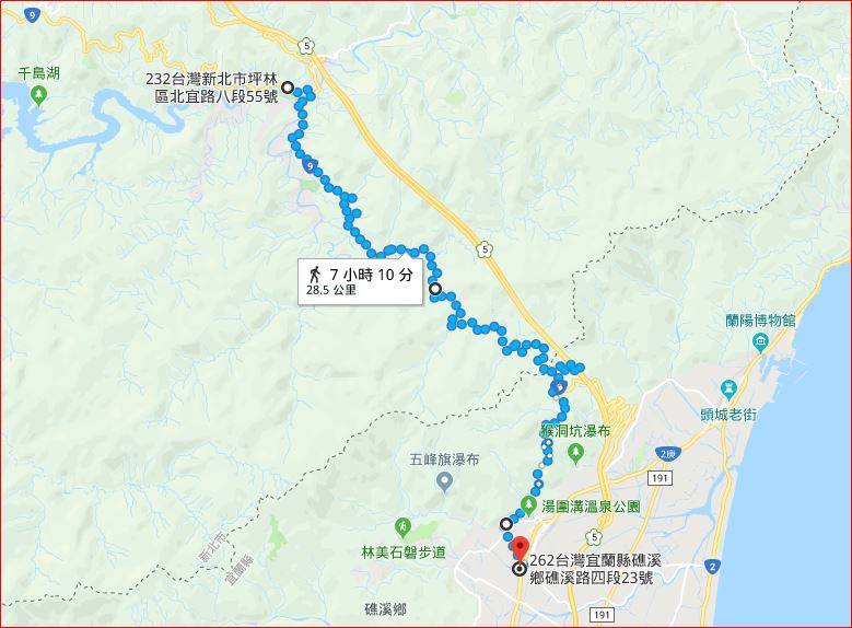 起點新北坪林區坪林牌樓旁-台九北宜公路-北宜縣界公園-跑馬古道(越野山徑)-直走礁溪大忠路-右轉礁溪路四段-100公尺右轉進礁溪國中大門口-左前方100公尺活動中心