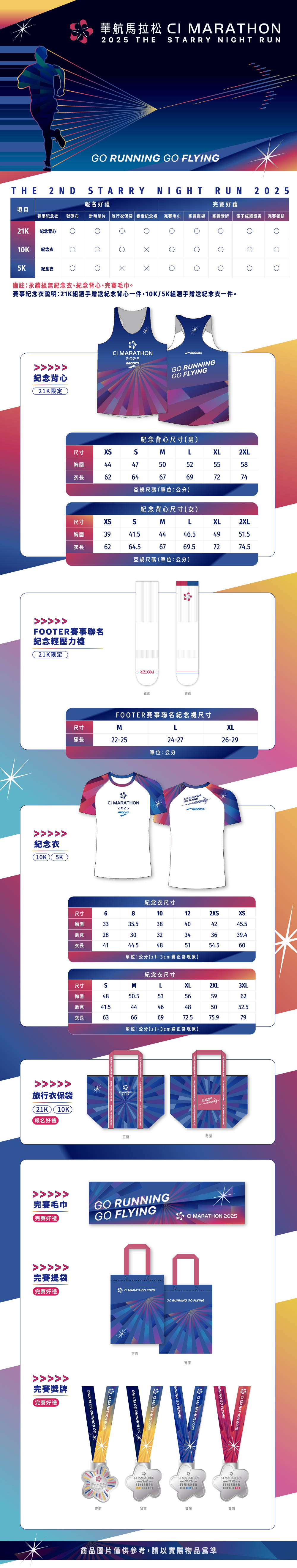 參賽贈品紀念衣、號碼布、計時晶片、參賽須知、旅行衣保袋、完賽獎牌、電子成績證書、完賽毛巾、完賽提袋、完賽餐點