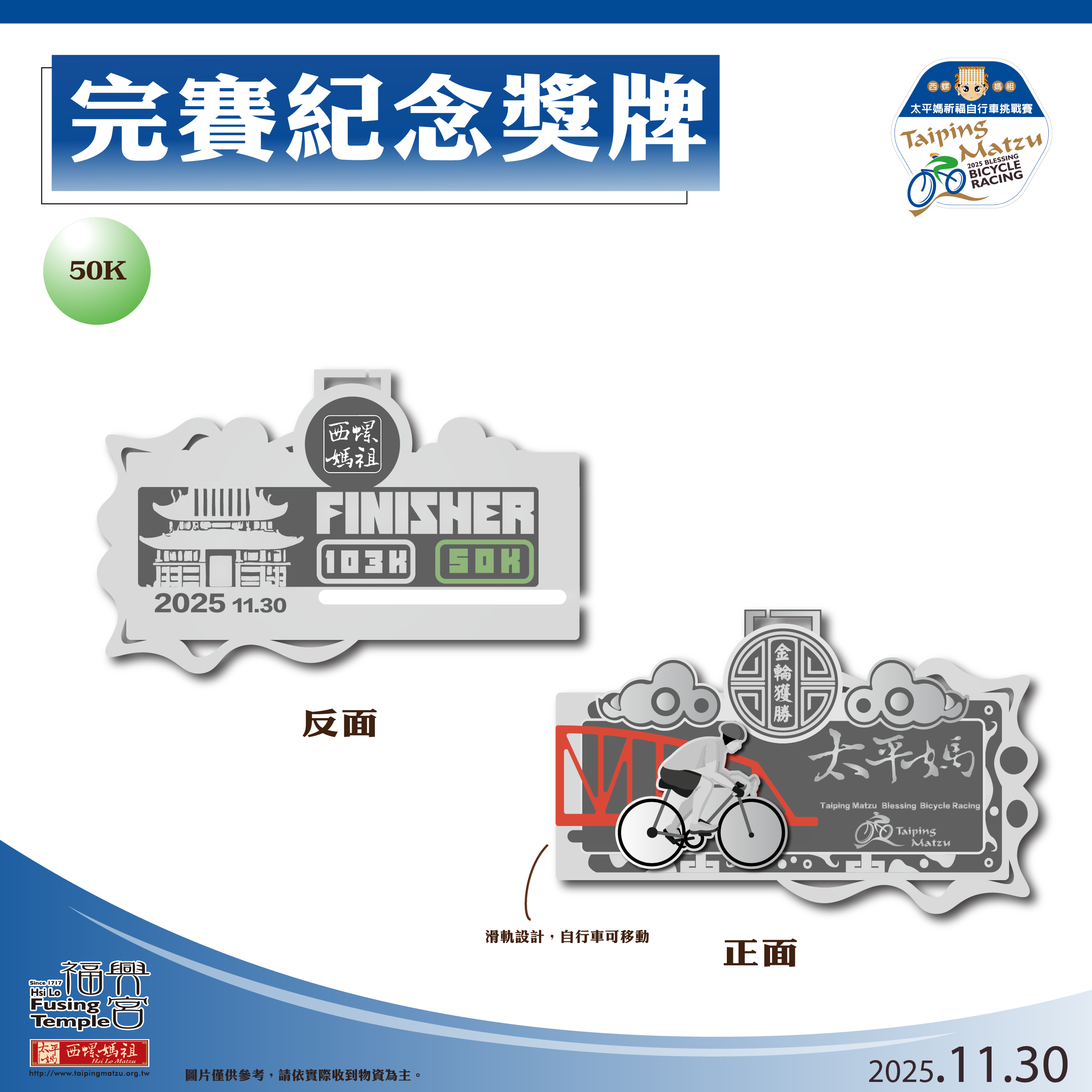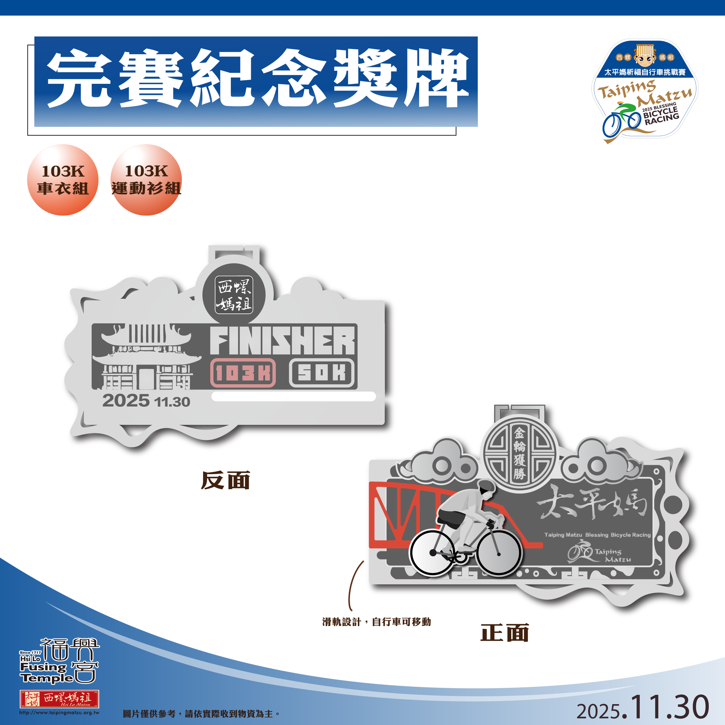 完賽禮 | 太平媽祈福平安禮、電子成績證明、完賽獎牌、完賽點心 | ||