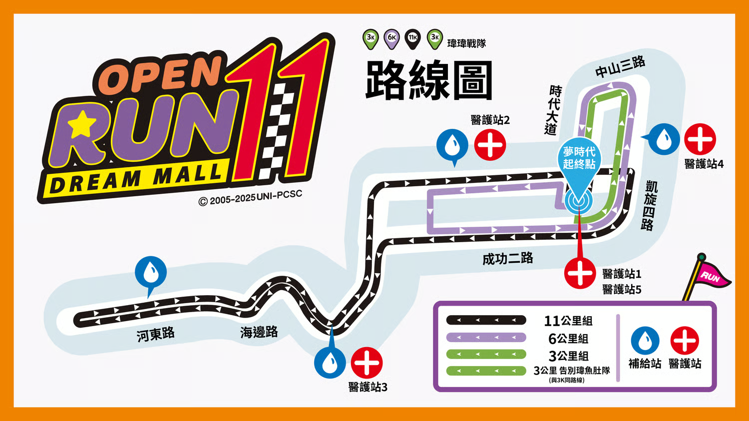 夢時代(起點)→直行時代大道→右轉中華五路→右轉凱旋四路→右轉成功二路至一路→左轉直行海邊路→直行河東路→七賢二路迴轉→直行河東路→右轉直行海邊路→直行三多四路→右轉中華五路→右轉時代大道→夢時代(終點) - 6公里組(限時1小時25分完成)
