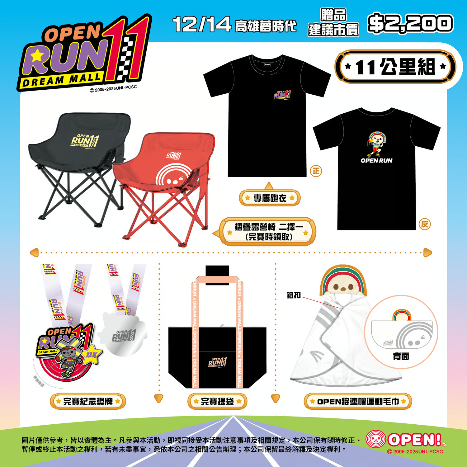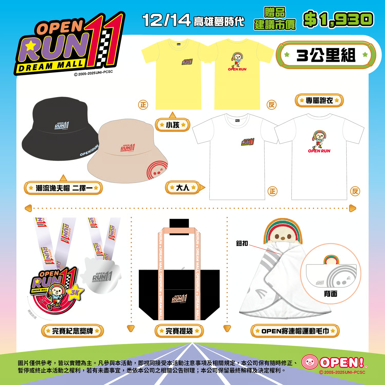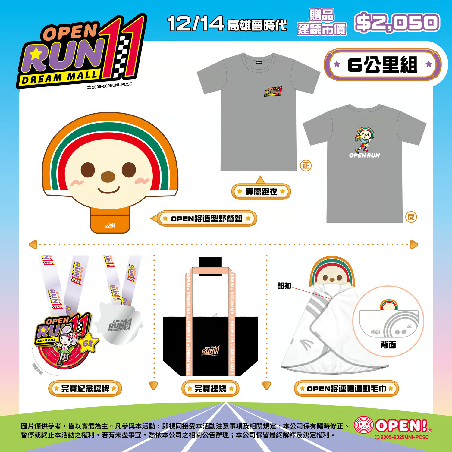 參賽贈品號碼布、跑衣、OPEN將造型野餐墊、完賽紀念獎牌、OPEN將連帽運動毛巾、電子完賽證書、完賽驚喜包