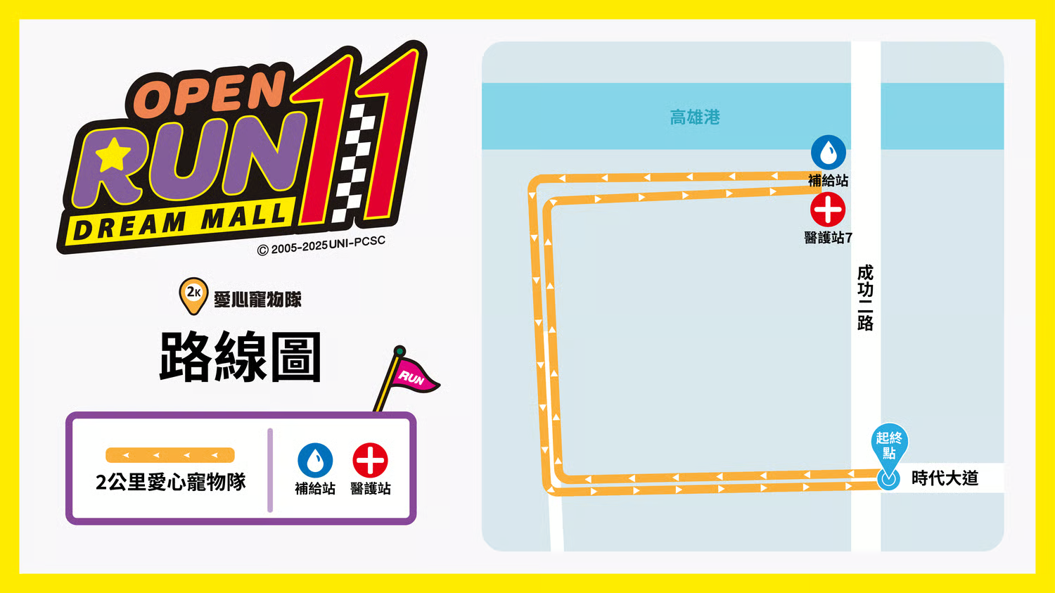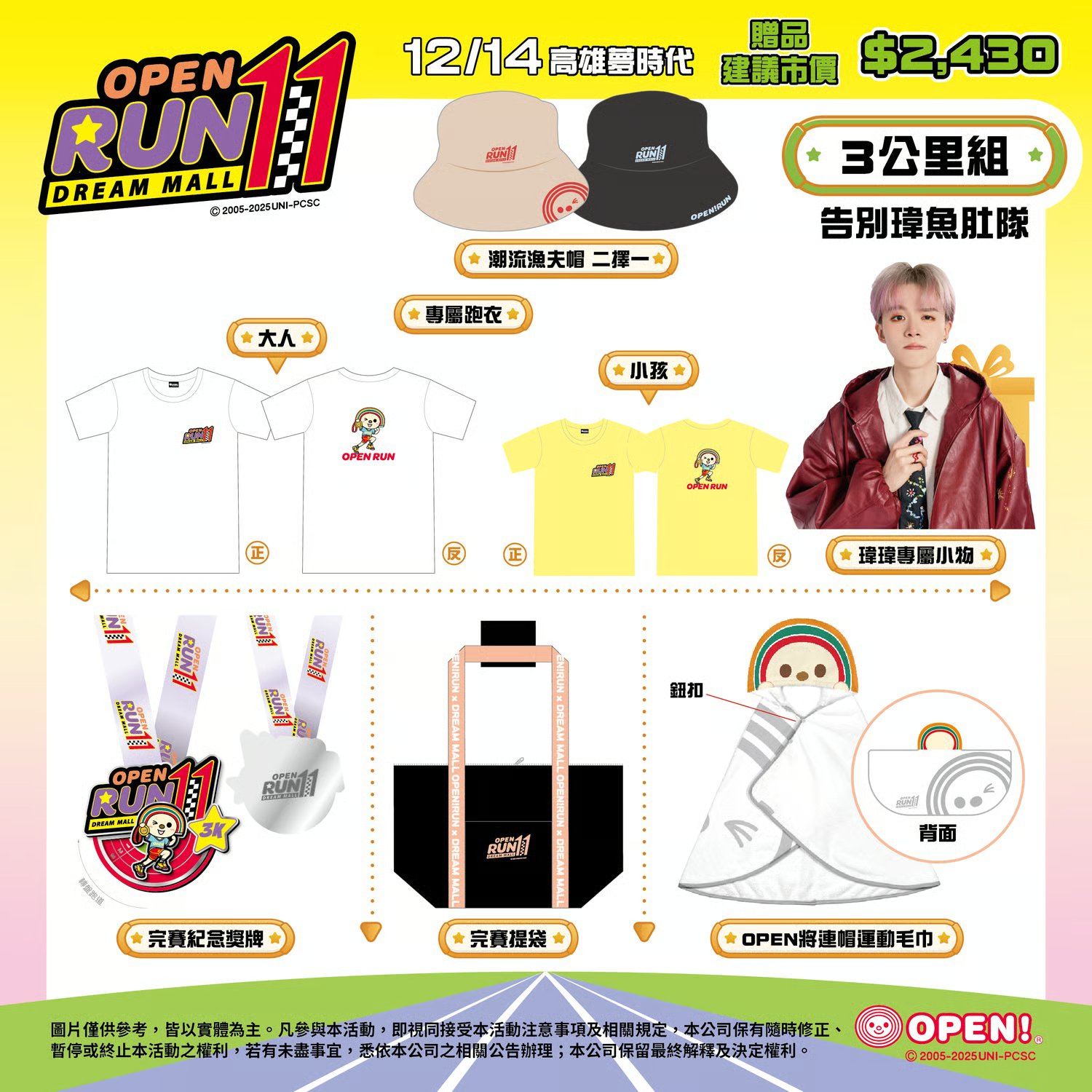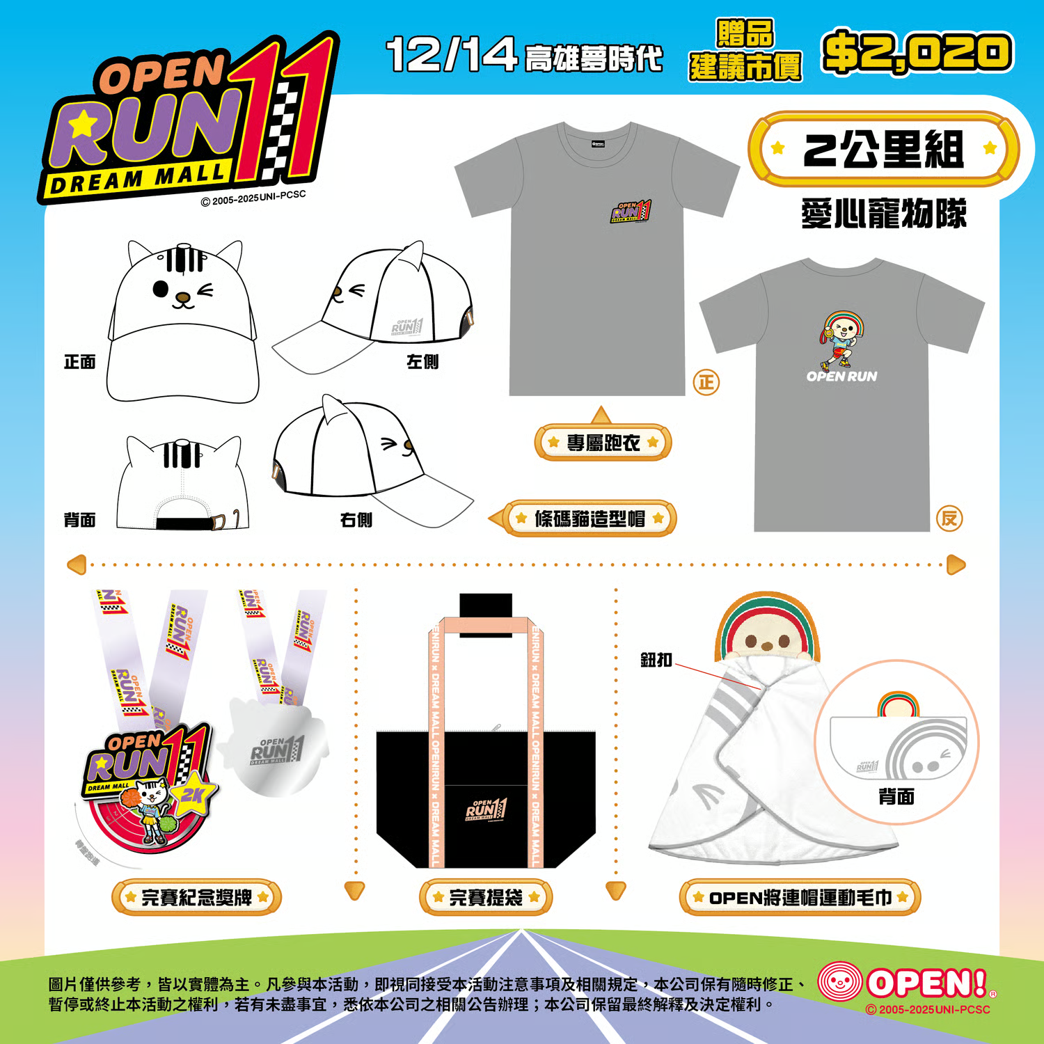 2公里 愛心寵物隊 早鳥優惠(9/10 12:00起至9/16 23:59止,報名且繳費完成者才可享有) 報名費現折100元 V V V V V UNIDESIGN新柔感抽取式 衛生紙乙串(110抽*8包) (價值109元/串) 電子兌換券兩張 V V V V V OPEN!一飛沖天宇宙飛行器(價值199元/個) 乙個 V V V V V 單筆報名每滿4人可獲得OPENPOINT點數500點 (可累贈,僅限團體報名) V V V V V 一般加碼(9/17 00:00起10/31 23:59止,報名且繳費完成者才可享有) AB原味/無加糖優酪乳902ml乙瓶(價值79元/瓶) 電子兌換券乙張 V V V V V UNIDESIGN新柔感抽取式 衛生紙乙串(110抽*8包) (價值109元/串) 電子兌換券乙張 V V V V V 報名贈品(賽前領取-郵寄/門市店取) 號碼布 V V V V 2張 跑衣 V V V V 1件 6K專屬好禮-OPEN將造型野餐墊 V 3K專屬好禮-潮流漁夫帽 V V 3K告別瑋魚肚隊專屬好禮-瑋瑋 限量專屬小物 V 2K愛心寵物隊專屬好禮-條碼貓造型帽 V 晶片 V 報名贈品(賽後領取-現場憑號碼布領取) 11K專屬好禮-摺疊露營椅