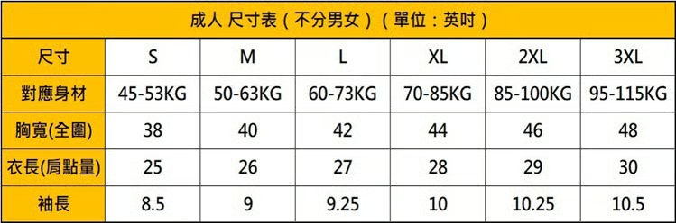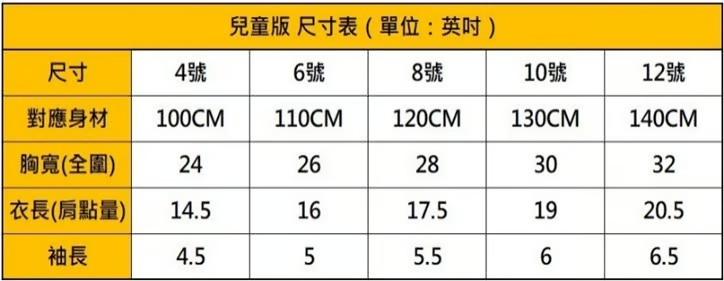 衣服尺寸表僅供參考(誤差值±5cm),以實際物品為主。