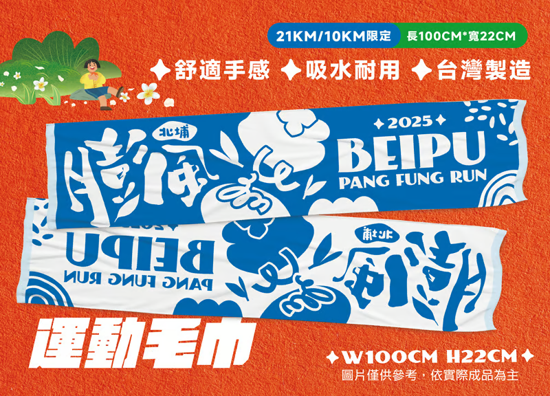 參賽贈品機能排汗衫、運動毛巾、運動頭巾、號碼布+別針(含計時晶片)、公共意外責任險、完賽獎牌、完賽證書、伴手禮、礦泉水