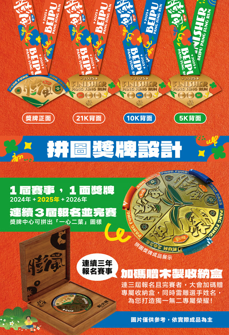 5公里完賽獎牌 O O O 完賽證書 O O O 伴手禮 O O O 礦泉水 O O O - ❖報名物資將於賽前一週以宅配寄送,其餘完賽好禮,於當日完賽禮區發放,若當天未至現場參賽,不另行補發。本次活動之贈品皆屬賽事消耗品,不接受賽後更換。