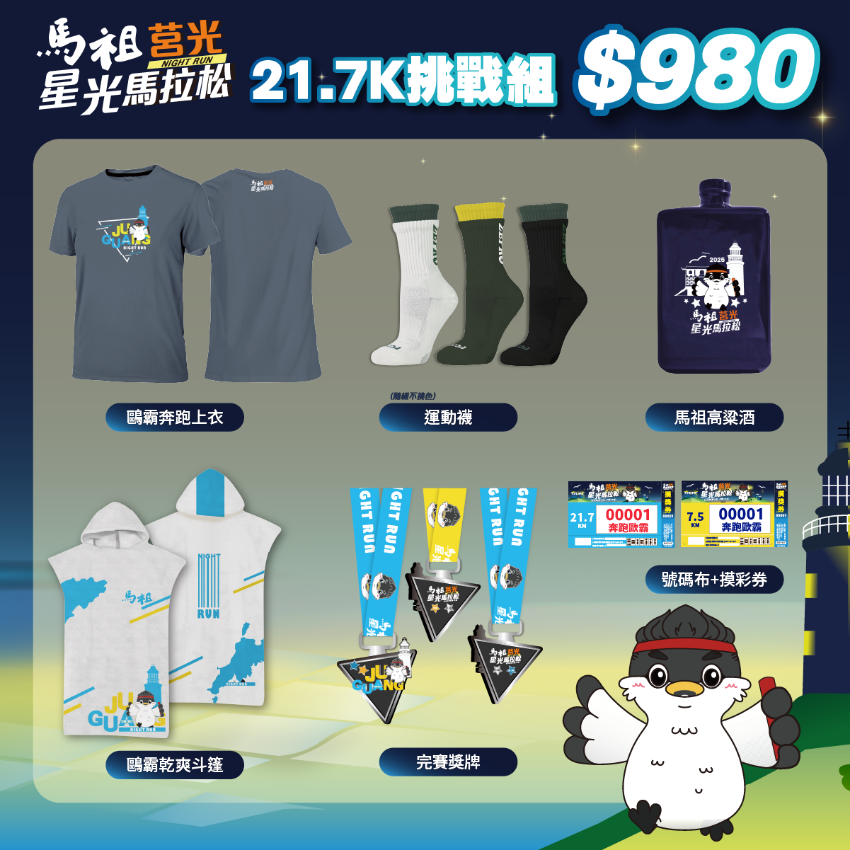 參賽贈品鷗霸奔跑上衣、鷗霸乾爽斗篷、機能運動襪、號碼布、拋棄式晶片、電子選手須知、馬祖高粱酒、完賽紀念獎牌、完賽電子證書、礦泉水