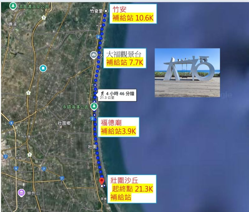 由壯圍沙丘旅遊服務園區出發沿宜蘭濱海自行車步道至竹安折返(詳圖). 來回21.3k . 全馬兩圈 .全程路線均是平路