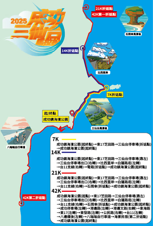 競賽項目競賽項目 全馬組(42.195km) 半馬組(21km) 小馬組(14km) 迷你馬組(7km) 費用 NT$:1300元 NT$:1150元 NT$:1000元 NT$:900元 須另加晶片押金100元,晶片押金將在活動當天歸還晶片時退還。 成功鎮民身份享100元優惠,活動當天憑號碼布及身分證件退還。 限時 6.5小時 4小時 2小時 1.5小時 限額 350人 350人 600人 700人 起跑時間 06:00 06:10 06:20 06:30 年齡限制 年滿18歲 年滿12歲 年滿9歲 不限年齡 報名及完賽物資項 目 參賽紀念衫 號碼布 計時晶片 完賽 獎牌 完 賽 證 書 完 賽 毛 巾 市集消費券 飲料 保險 全馬組(42.195km) ●