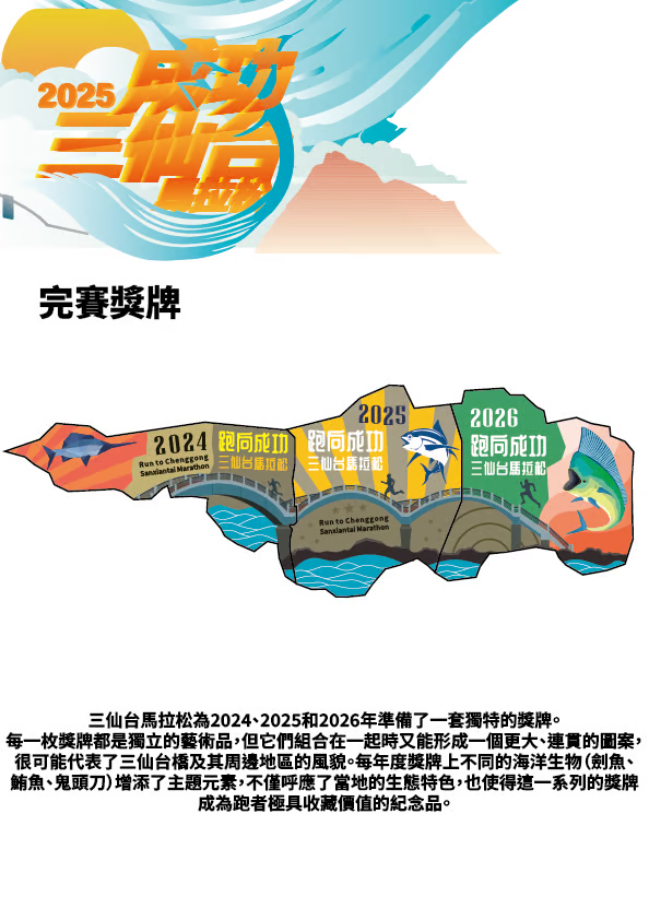參賽贈品參賽紀念衫、號碼布、計時晶片、完賽獎牌、完賽證書、完賽毛巾、市集消費券、飲料、保險