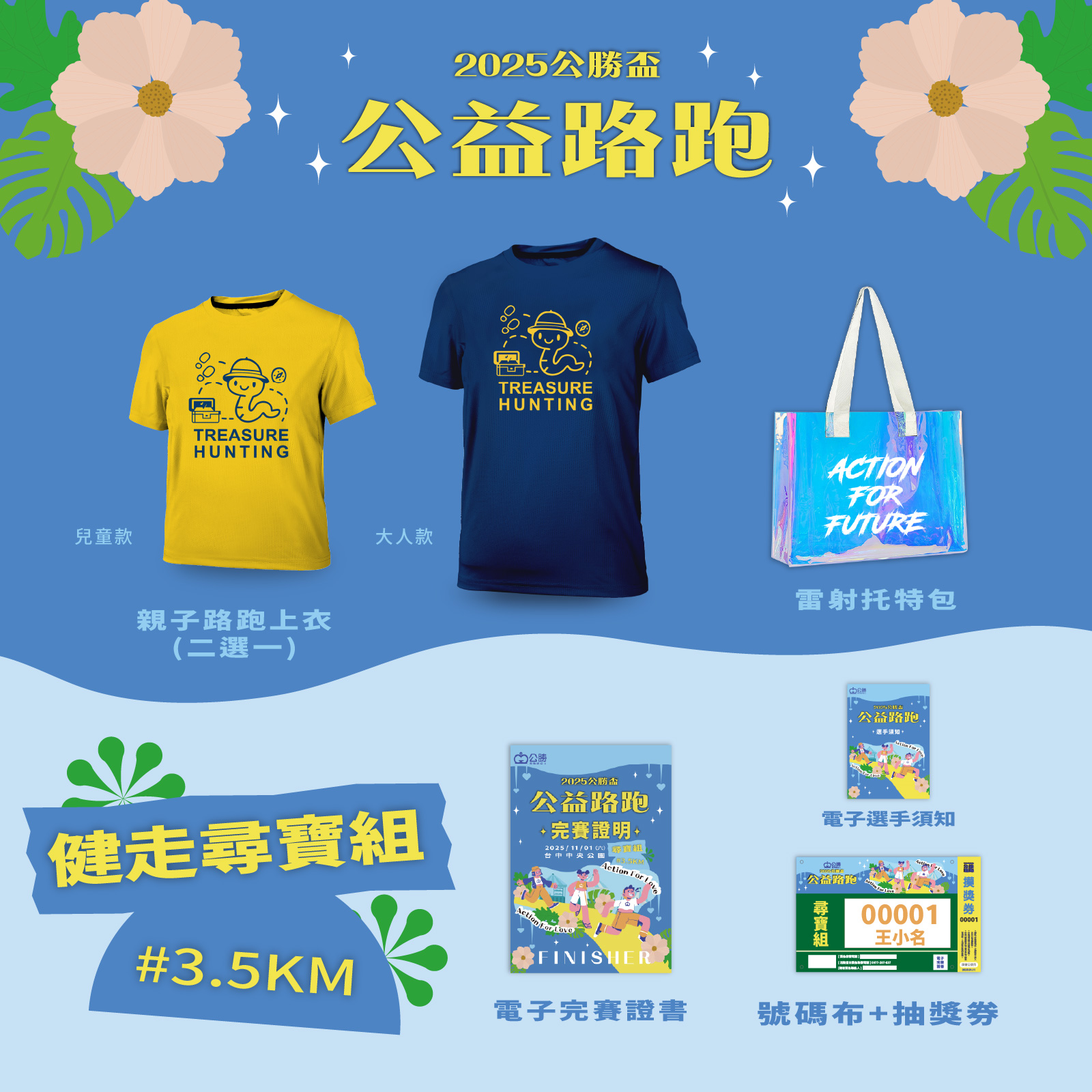 參賽贈品活力組上衣、號碼布、尋寶組上衣(二選一)、電子選手須知、完賽紀念獎牌、雷射托特包 、完賽電子證書、礦泉水