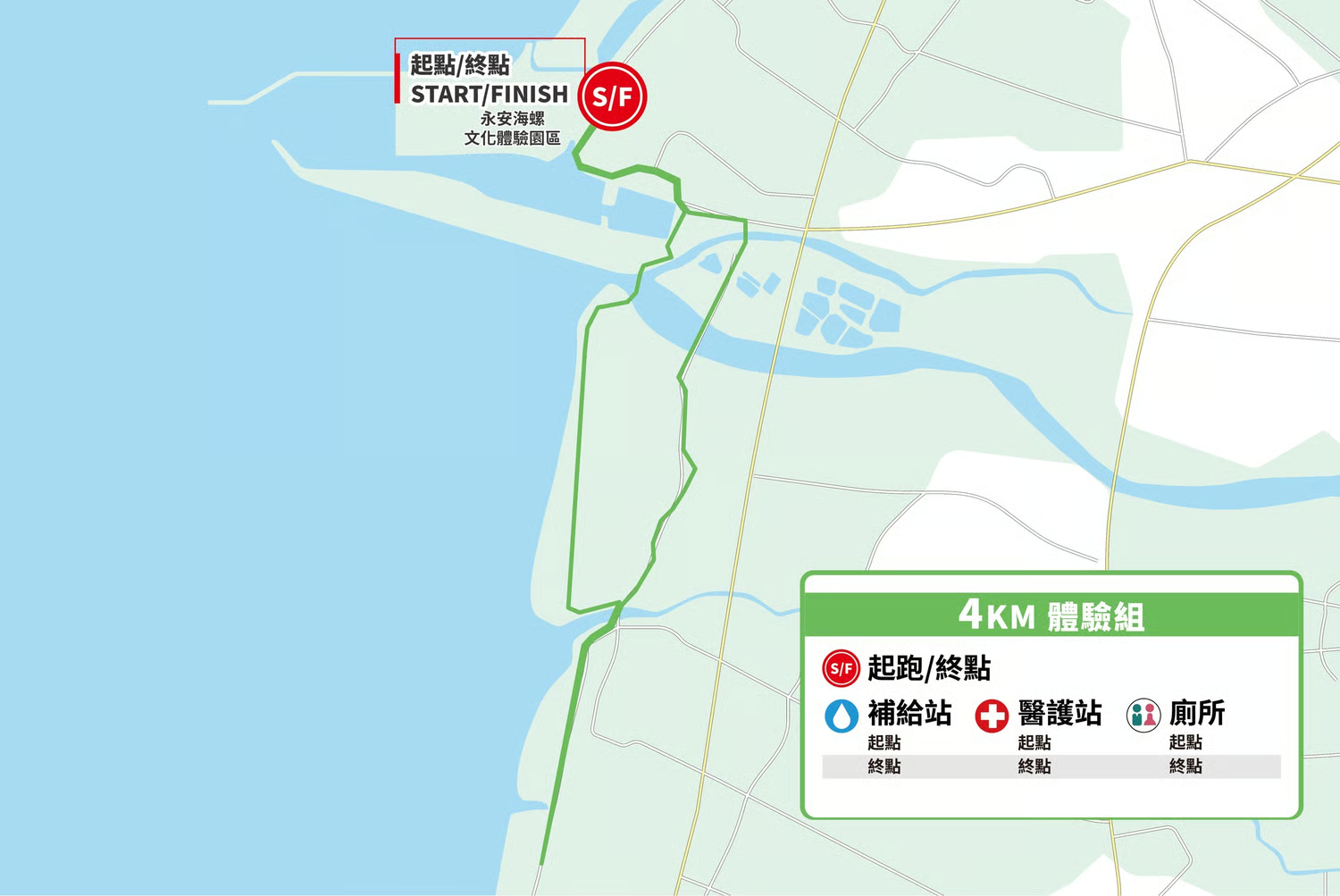 4K健康組,限時1小時完賽 永安海螺文化體驗園區(起點)→新港路→中山西路三段→觀海路二段(2KM處迴轉)→防汛道路→笨鯊橋→新港路→永安海螺文化體驗園區(終點)