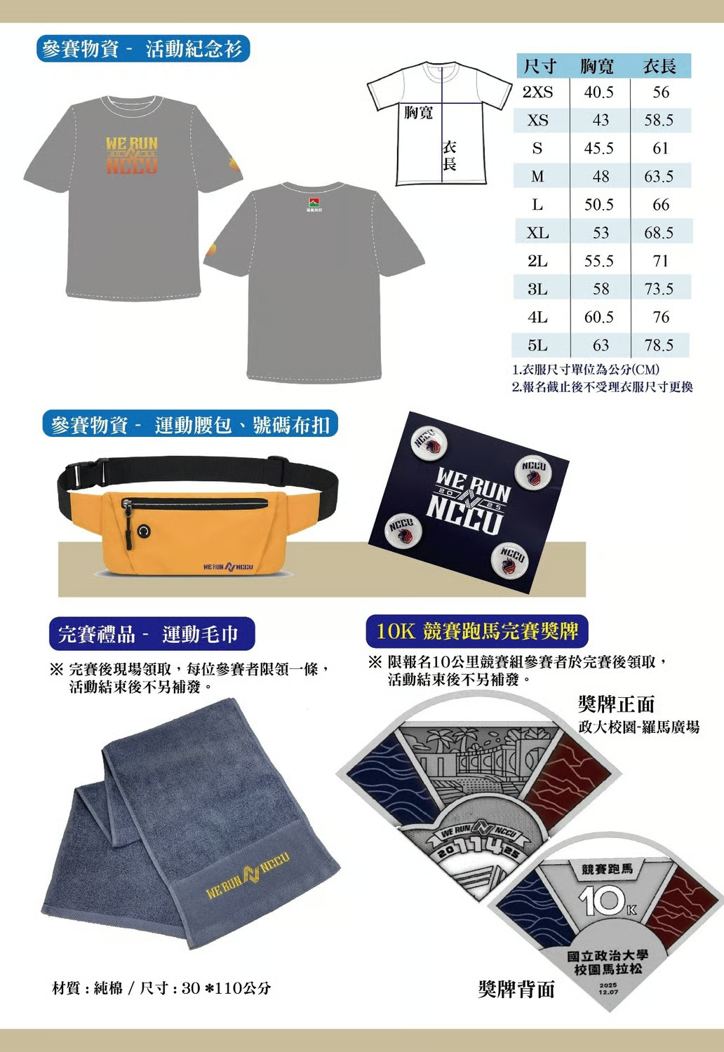 參賽贈品紀念衫、運動腰包、號碼布扣(4個)、晶片號碼布、完賽獎牌、紀念毛巾、摸彩券