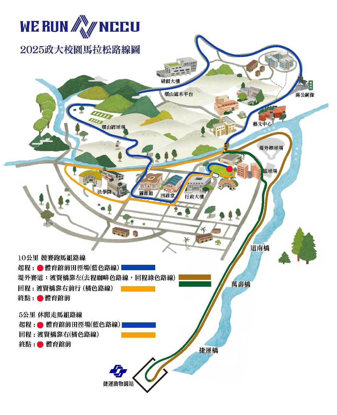 2025政大校園馬拉松路線說明 5公里休閒走馬組 10公里競賽跑馬組 【起點】體育館前