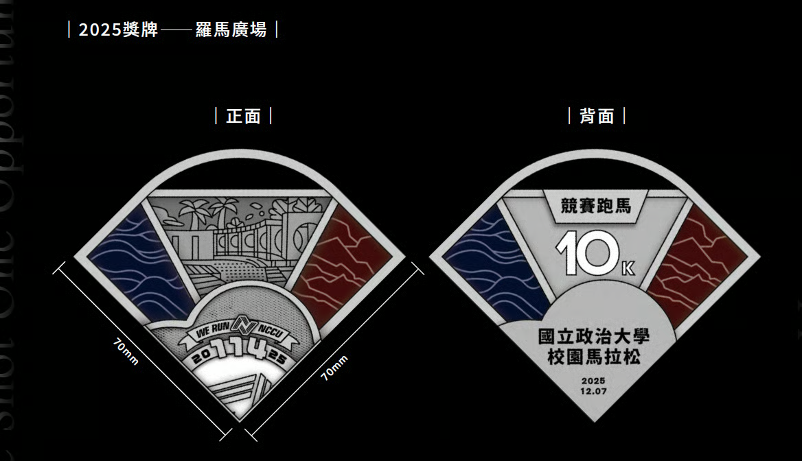 【完賽獎牌】2023年起至2026年的完賽獎牌設計,每年的獎牌上都有以簡約線條組成的校園一隅,分別為2023年政大校門口、2024年體育館、2025年羅馬廣場以及2026年四維堂。獎牌兩邊則配以意象型的河流、山巒圖樣設計,象徵政大依山傍水的宜人環境。