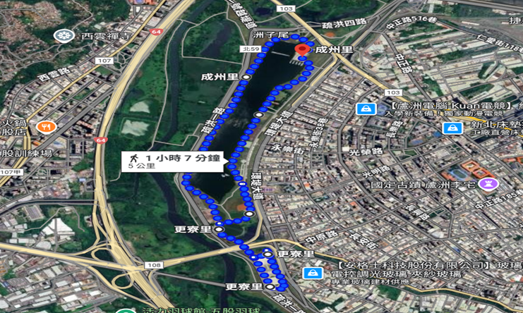 起點新北微風運河廣場→右轉接自行車道→經永安大橋下→繞追風廣場→接繞洲子尾溝→終點新北微風運河廣場