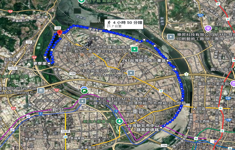 起點 新北微風運河廣場→往蘆洲自行車道→靠左接堤後路→折返→至會場繞洲子尾溝一圈→終點 新北微風運河廣場