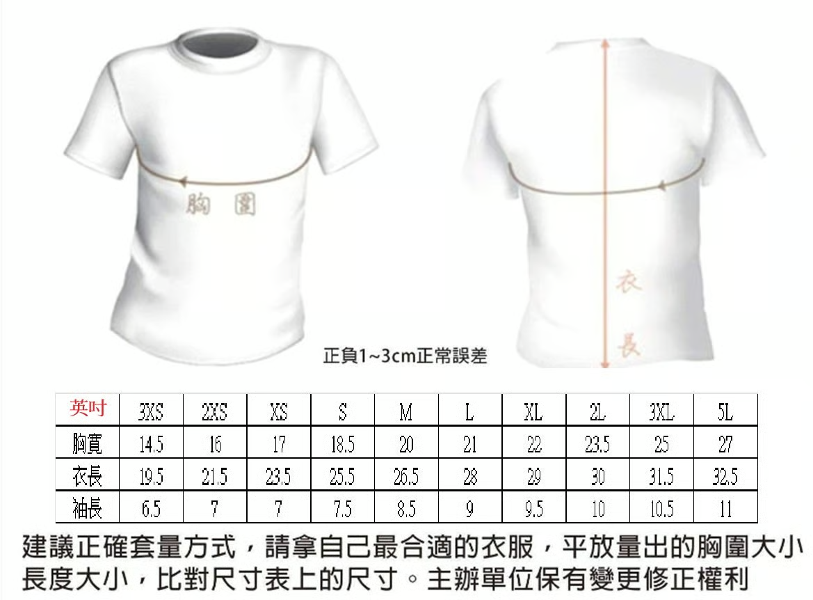 全馬組 半馬組 10公里組 5公里組 報名費用 1100元 850元 650元 450元 押金 100元 100元 100元 起跑時間 06:00 06:00 06:10 06:15 結束時間 14:00 10:00 08:30 07:30 人數限制 800 400 400 400 紀念衣尺寸對照表:未勾選尺寸者將以L號發送
