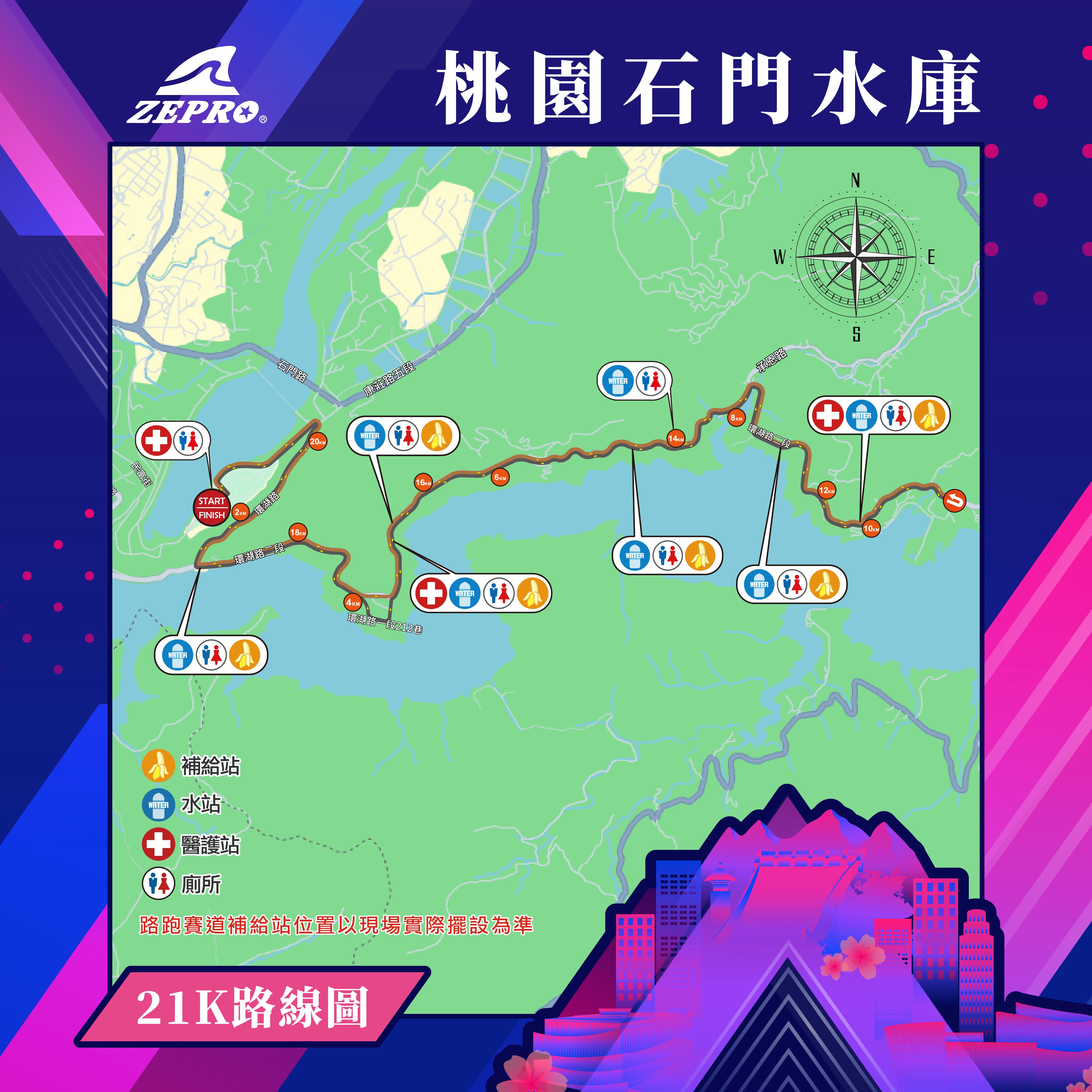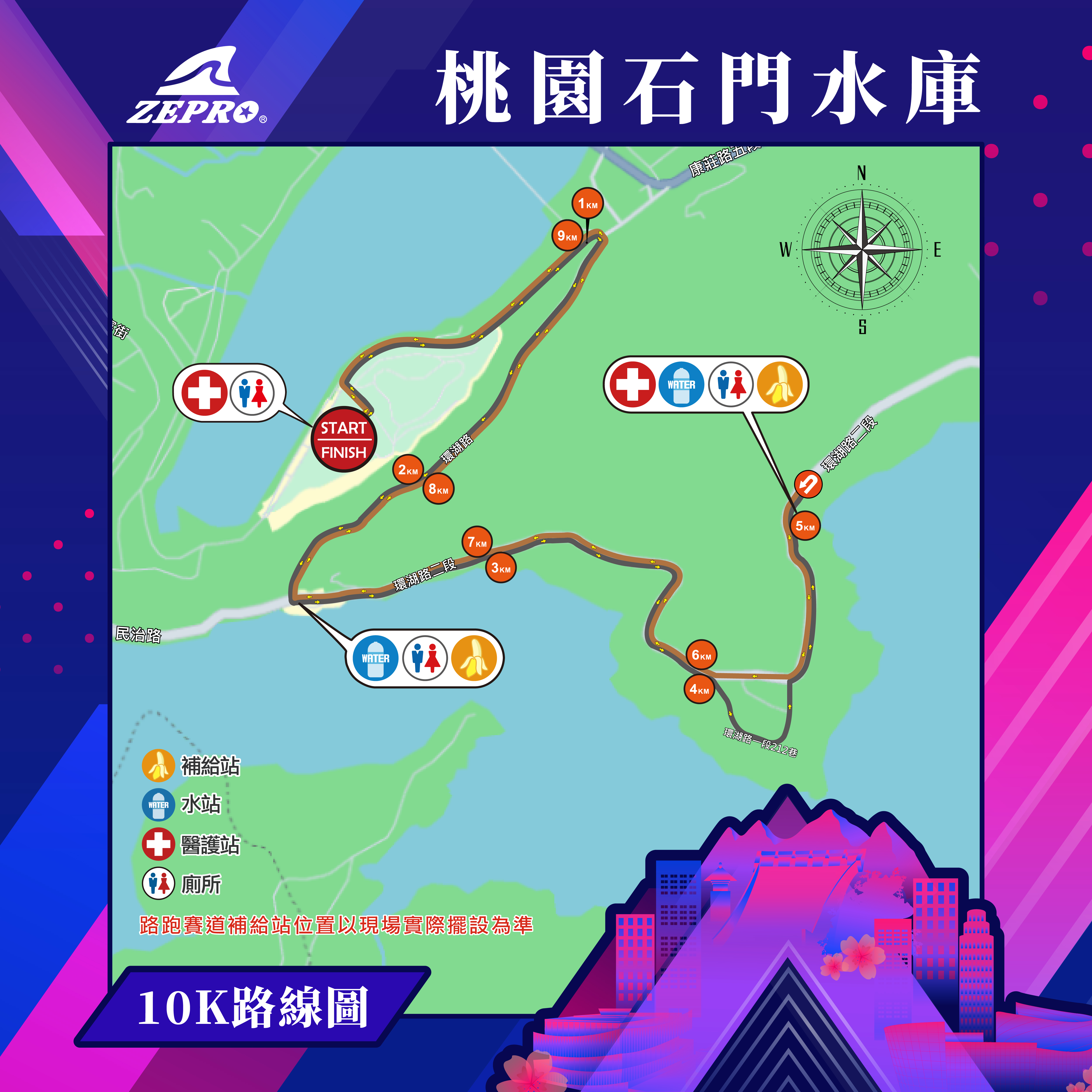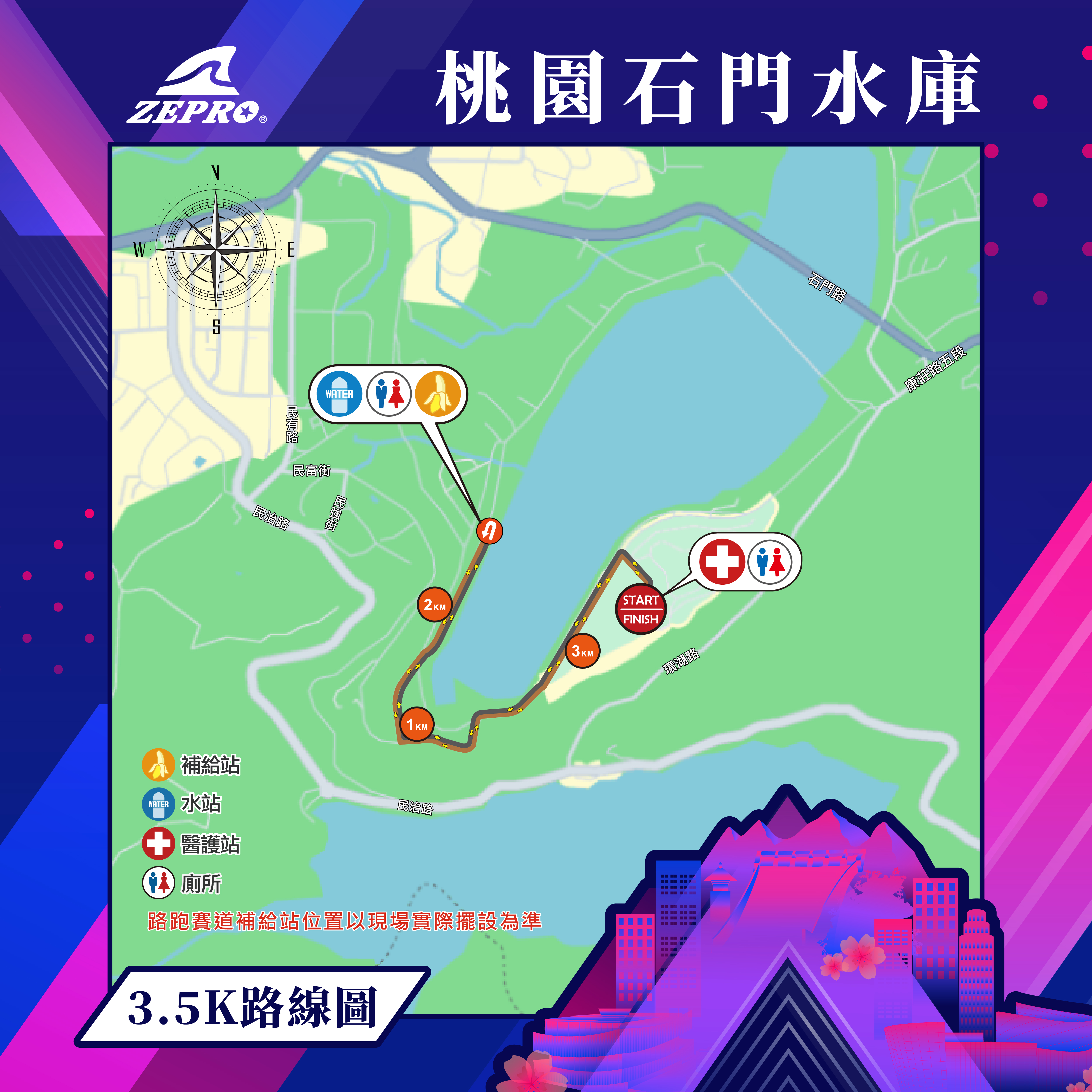 路線:起點(START)→起跑後左轉→經石門水庫溢洪道平台左轉→往北苑停車場方向右轉→至檢查點原路折返→終點(FINISH)
