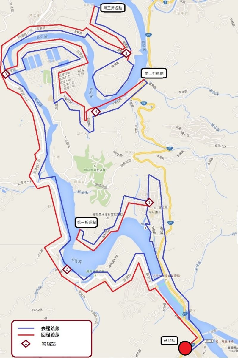 會場新北市童軍龜山營地出發走新烏路(台9甲線),至新烏路(台9甲線)指標5.5公里向左走櫻花街接自強路右轉接屈尺路接頂石厝路,至濛濛湖(第一折返點)迴轉循原路接屈尺路再右轉走自強路接梅花湖步道,出屈尺後走新烏路約300公尺向右過廣興橋接廣興路接小坑一路接小坑二路接新潭路一段(北105鄉道),至思源橋右轉過橋,走直潭路接小粗坑路至路底(第二折返點)迴轉循原路回思源橋,右轉走新潭路一段接金龍路接灣潭路後於新店渡口(第三折返點)迴轉循原路回金龍路接新潭路一段,至新潭路一段接二段時向左走接小坑二路,再接小坑一路接廣興路至松林路右轉走松林路接新烏路回會場新北市童軍龜山營地結束