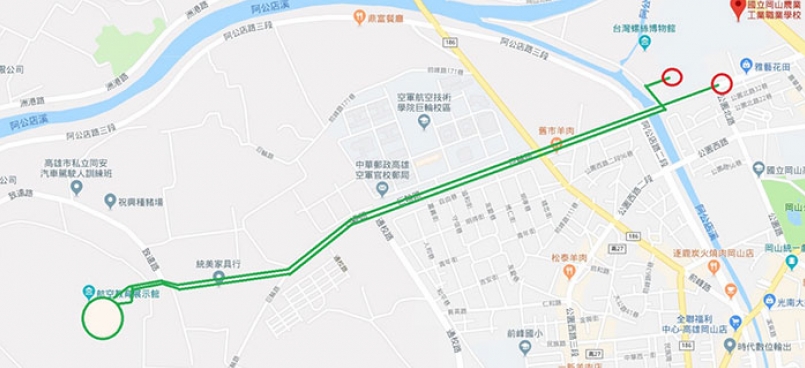 岡山農工河華路與公園路口(起跑)→河華路→巨輪路→航空展示館折返→致遠路→巨輪路→河華路→岡山農工田徑場(終點)
