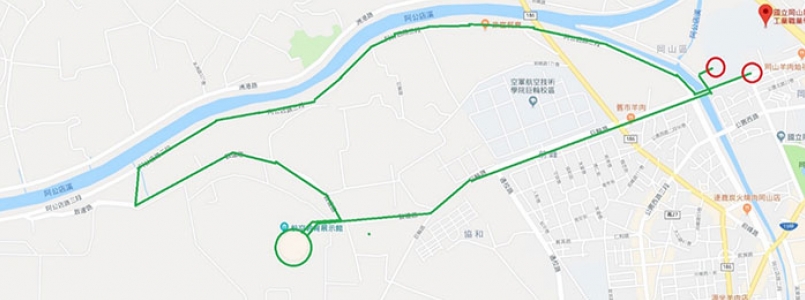 岡山農工河華路與公園路口(起跑)→河華路→阿公店路三段右轉→山霸畑路→維仁橋下左轉→台17線鹽埕大路往南→中正東路→中正東路自由巷右轉→中正南路1巷→海尾路→漯底海堤→阿公店溪南側河堤→舊港橋→文安北路左轉(阿公店溪南側)→山霸畑路→阿公店路三段→致遠路右轉→航空展示館右轉→致遠路→巨輪路→河華路→岡山農工田徑場(終點)