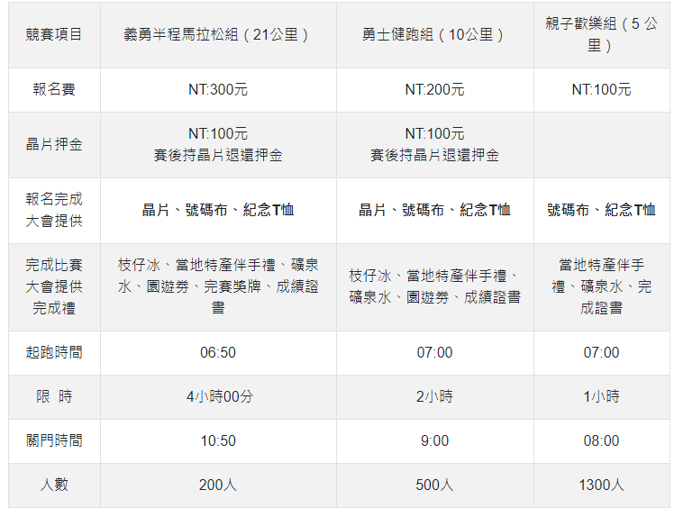 參賽贈品晶片、號碼布、紀念T恤、枝仔冰、當地特產伴手禮、礦泉水、園遊劵、成績證書