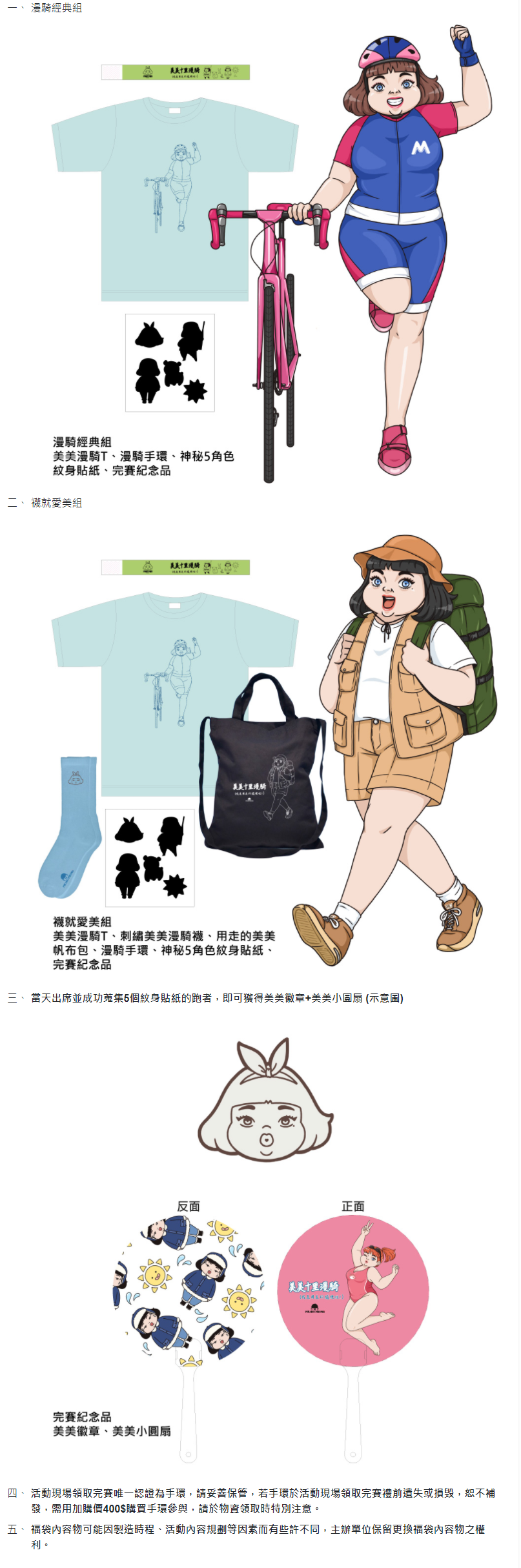 參賽贈品漫騎T-shirt、漫騎手環、五隻美美紋身貼紙、美美徽章、美美小圓扇