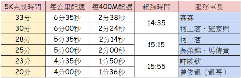 活動將於 13:40 開始檢錄,14:10 開場。服務新竹測五千的配速列車長如下: