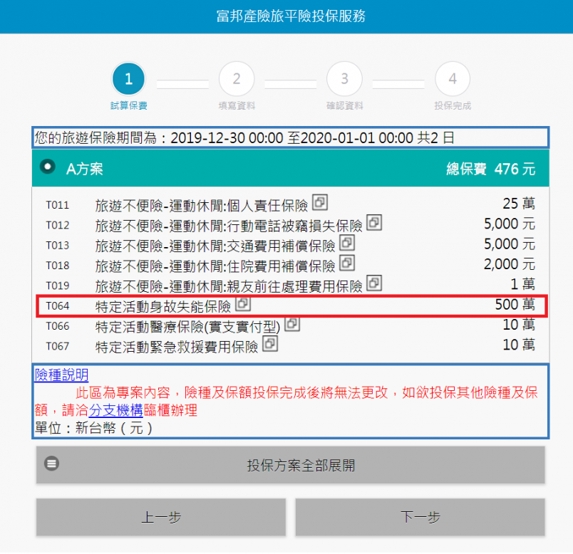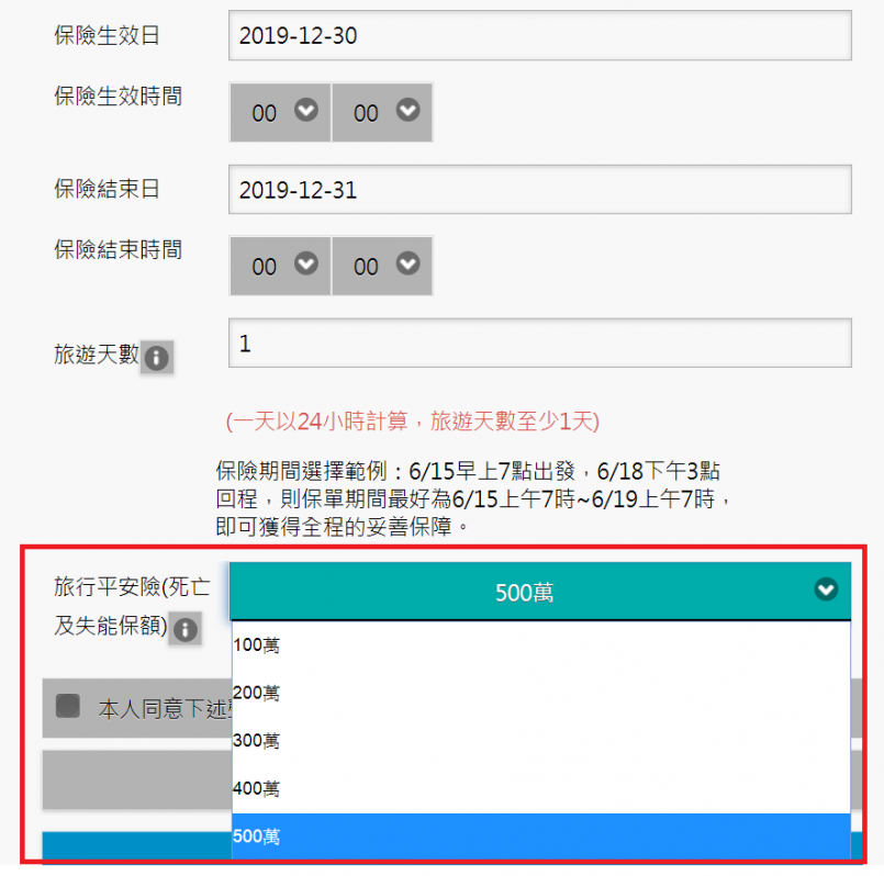 輸入姓名、身分證字號等基本資料後,選擇保險期間,其中還有一個項目可自行選擇保險額度,「死亡及失能保險」(100 萬~500 萬)。